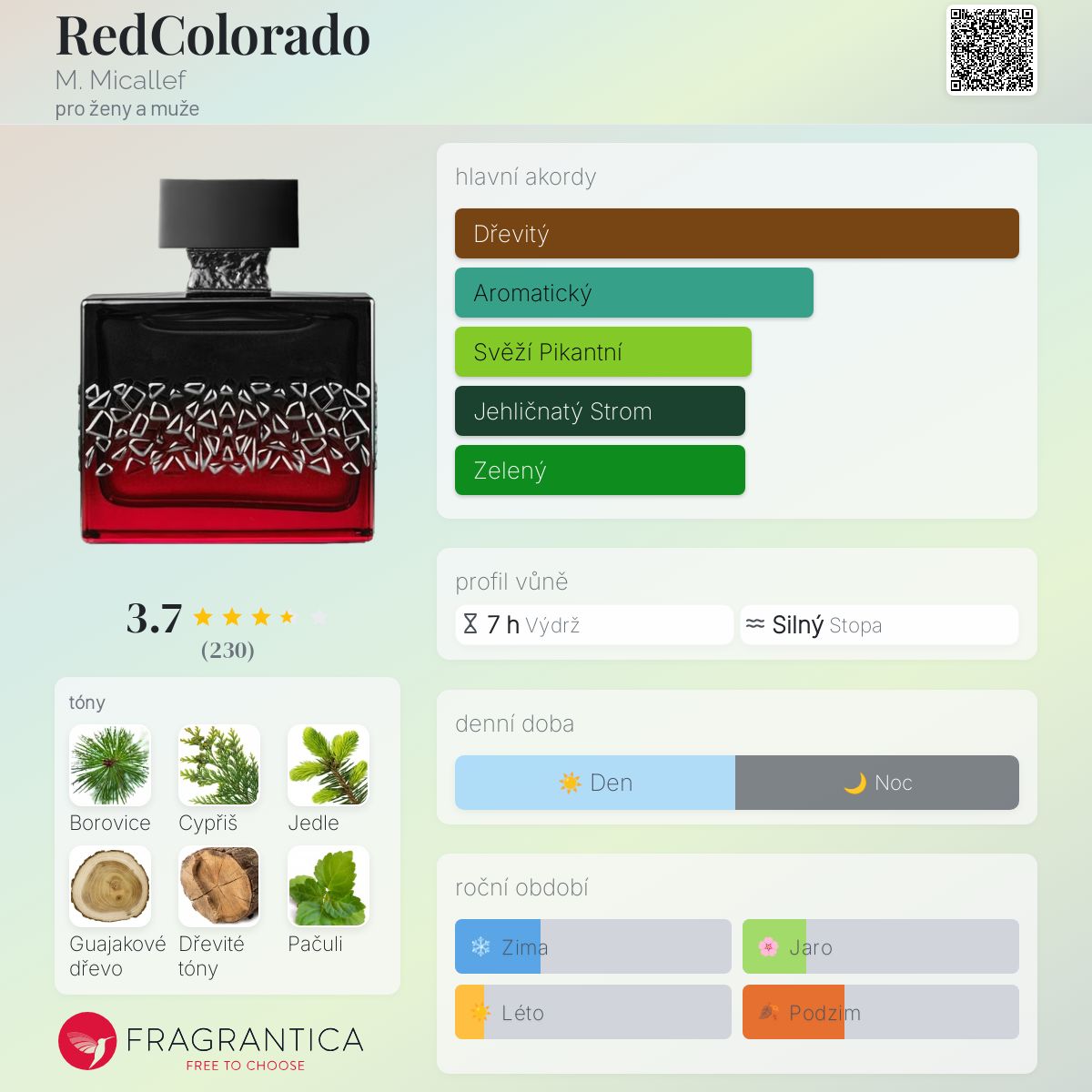 RedColorado podle M. Micallef je vůně pro ženy a muže. RedColorado byl/a uveden/a v roce 2023. "Nosem" za touto vůní je Urs Castelletti. Vrchní tóny jsou Borovice, Cypřiš, Jedle, Zelené listí a Bergamot; střední tóny jsouBorovice, Guajakové dřevo, Dřevité tóny, Pačuli, Cedr, Santalové dřevo a Růže ; základní tóny jsou Kůže a Vanilka.
