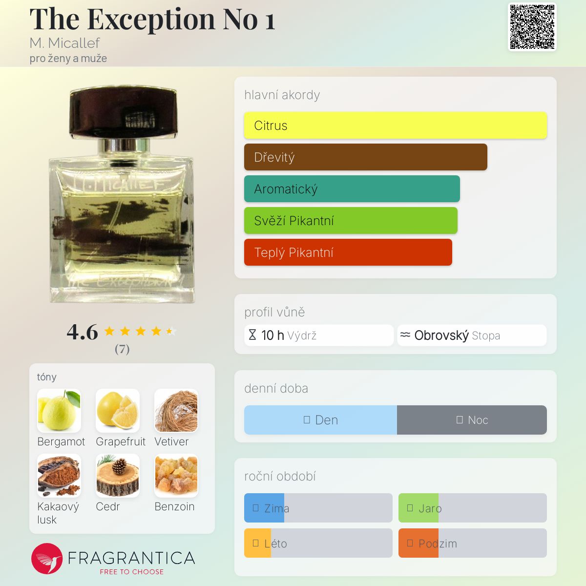 The Exception No 1 podle M. Micallef je Orientální Vanilla vůně pro ženy a muže. "Nosem" za touto vůní je Geoffrey Nejman. Vrchní tóny jsou Bergamot, Grapefruit a Hořký pomeranč; střední tóny jsouVetiver, Cedr a Pepř ; základní tóny jsou Kakaový lusk a Benzoin.