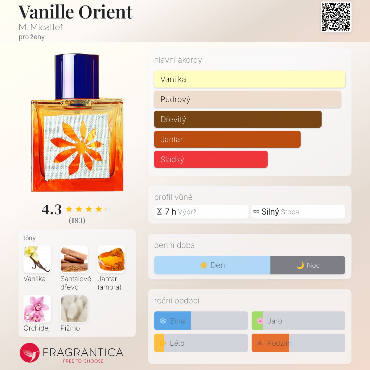 Vanille Orient podle M. Micallef je Orientální Vanilla vůně pro ženy. Vanille Orient byl/a uveden/a v roce 2012. "Nosem" za touto vůní je Jean-Claude Astier. Vrchní tón je Vanilka ; střední tóny jsouSantalové dřevo a Orchidej ; základní tóny jsou Jantar (ambra) a Pižmo.