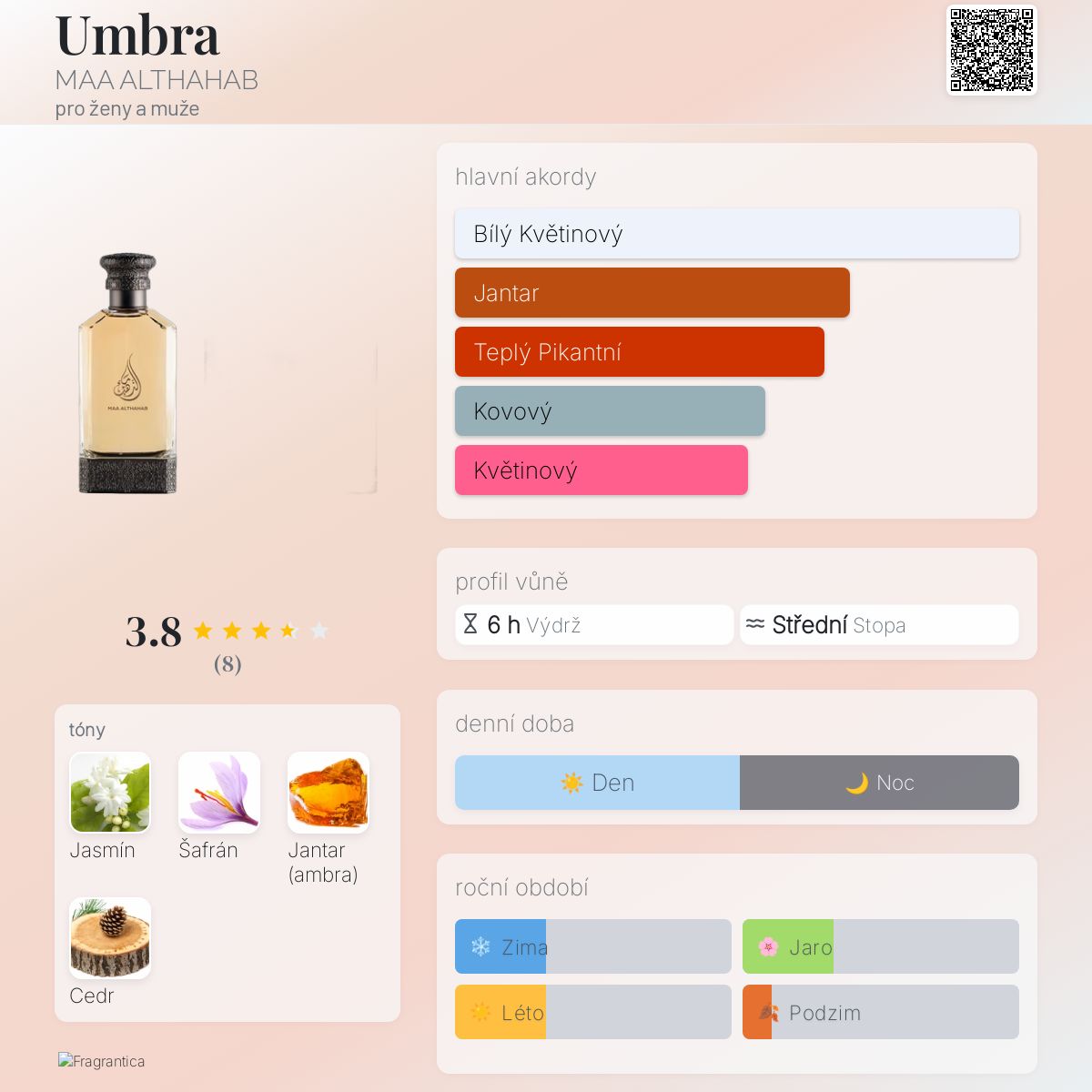 Umbra podle MAA ALTHAHAB je Orientální Woody vůně pro ženy a muže. Umbra byl/a uveden/a v roce 2021. Vrchní tóny jsou Jasmín a Šafrán; střední tón jeJantar (ambra) ; základní tón je Cedr.
