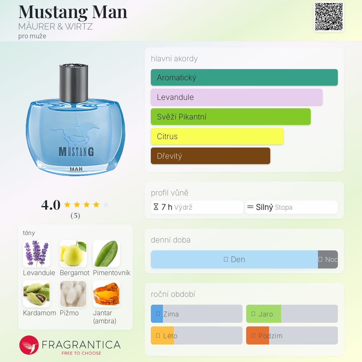 Mustang Man podle MÄURER & WIRTZ je Aromatic Spicy vůně pro muže. Mustang Man byl/a uveden/a v roce 2006. Vrchní tóny jsou Levandule, Bergamot, Pimentovník a Kardamom; základní tóny jsou Pižmo, Jantar (ambra), Guajakové dřevo a Cedr.