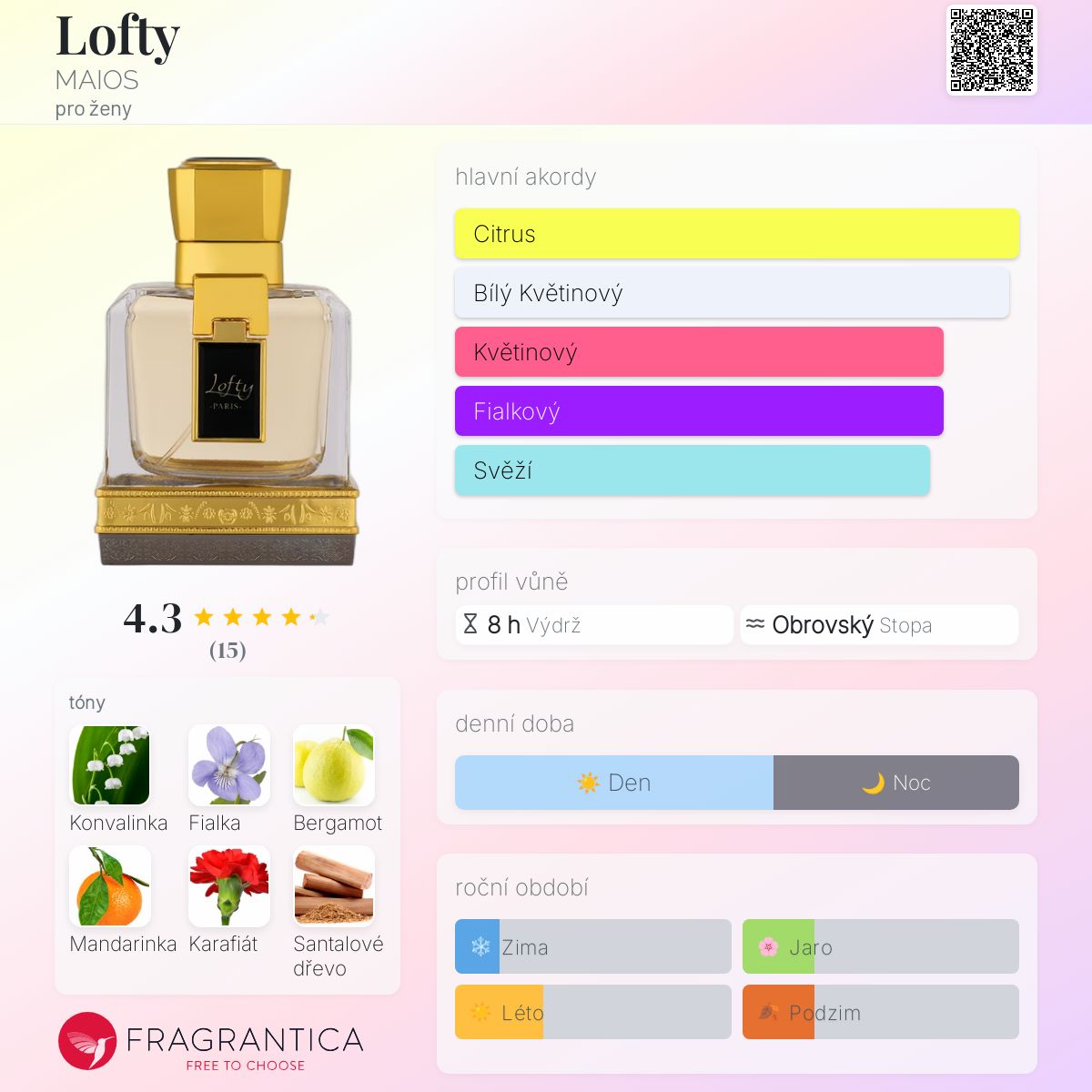 Lofty podle MAIOS je Floral Woody Musk vůně pro ženy. Lofty byl/a uveden/a v roce 2020. "Nosem" za touto vůní je Natalie Gracia-Cetto. Vrchní tóny jsou Fialka, Bergamot a Mandarinka; střední tóny jsouKonvalinka, Fialka a Karafiát ; základní tóny jsou Santalové dřevo, Vetiver a Pačuli.