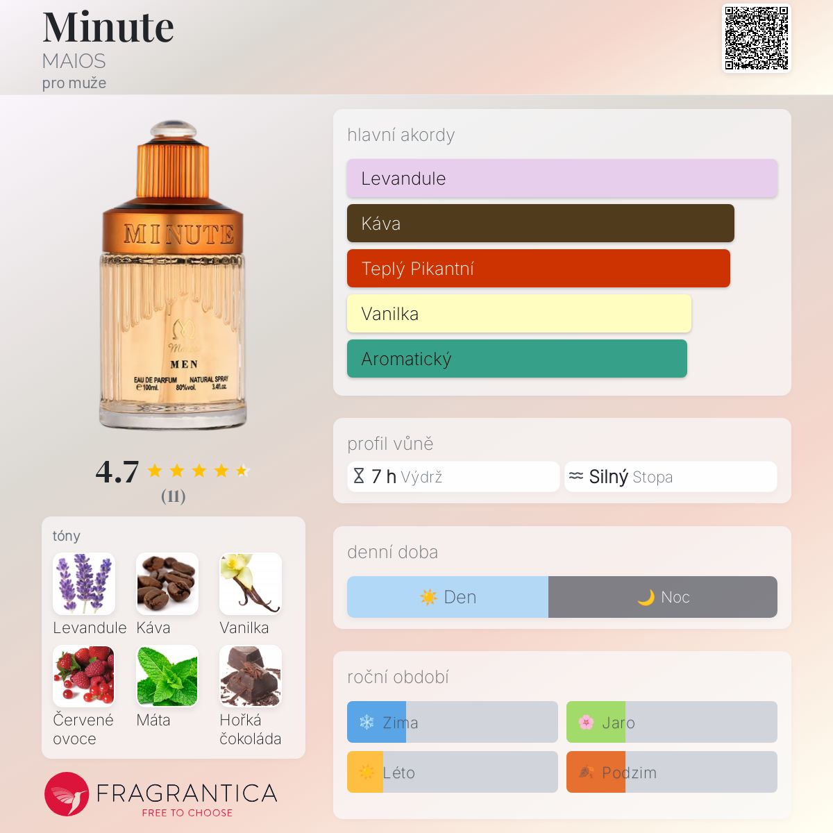 Minute podle MAIOS je Aromatic Fougere vůně pro muže. Minute byl/a uveden/a v roce 2015. "Nosem" za touto vůní je Sonia Constant. Vrchní tóny jsou Levandule, Máta a Fialka; střední tóny jsouVanilka, Červené ovoce a Čokoláda ; základní tóny jsou Káva, Pačuli a Santalové dřevo.