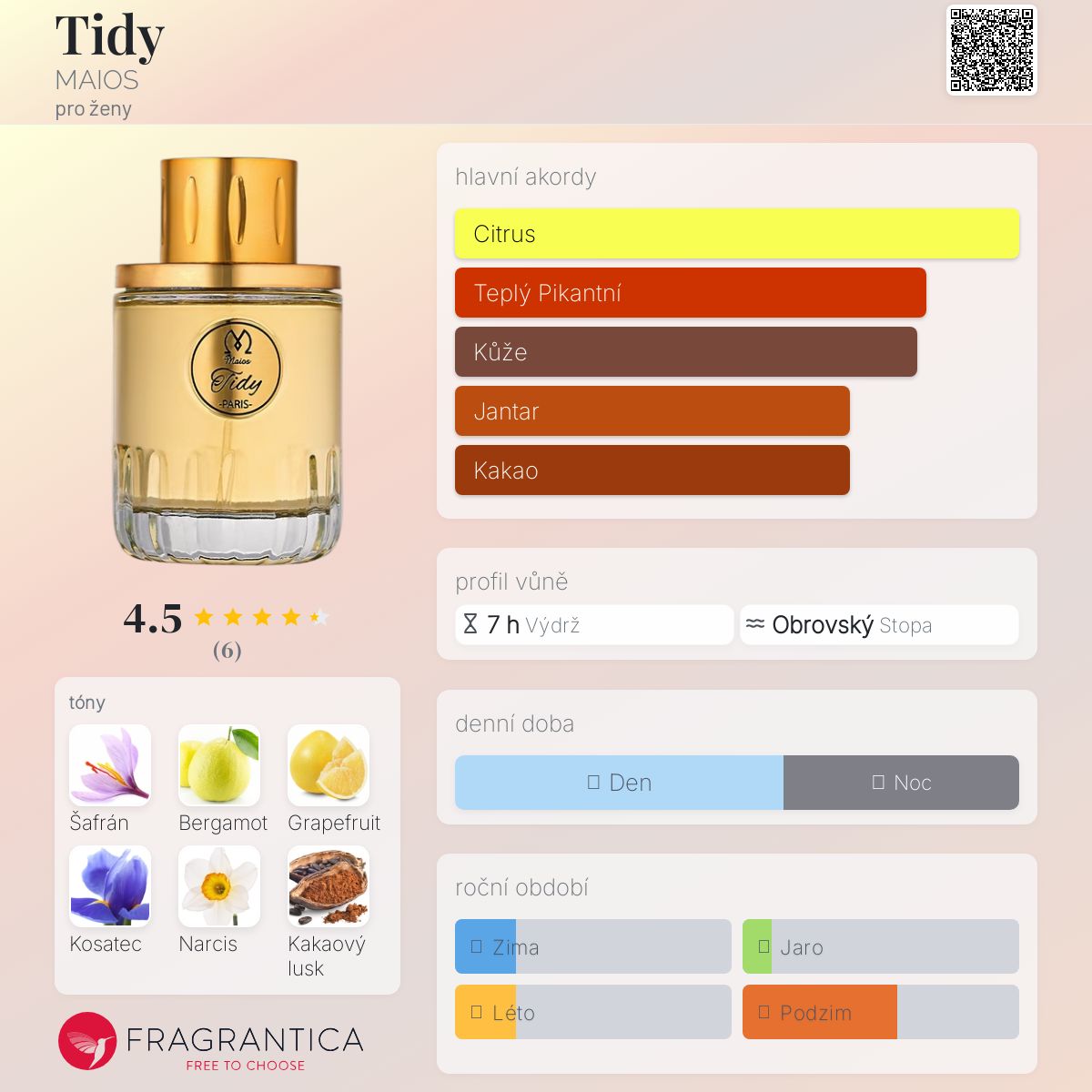 Tidy podle MAIOS je Orientální Floral vůně pro ženy. Tidy byl/a uveden/a v roce 2021. "Nosem" za touto vůní je Dominique Ropion. Vrchní tóny jsou Šafrán, Bergamot a Grapefruit; střední tóny jsouKosatec a Narcis ; základní tóny jsou Kakao, Jantar (ambra) a Kůže.