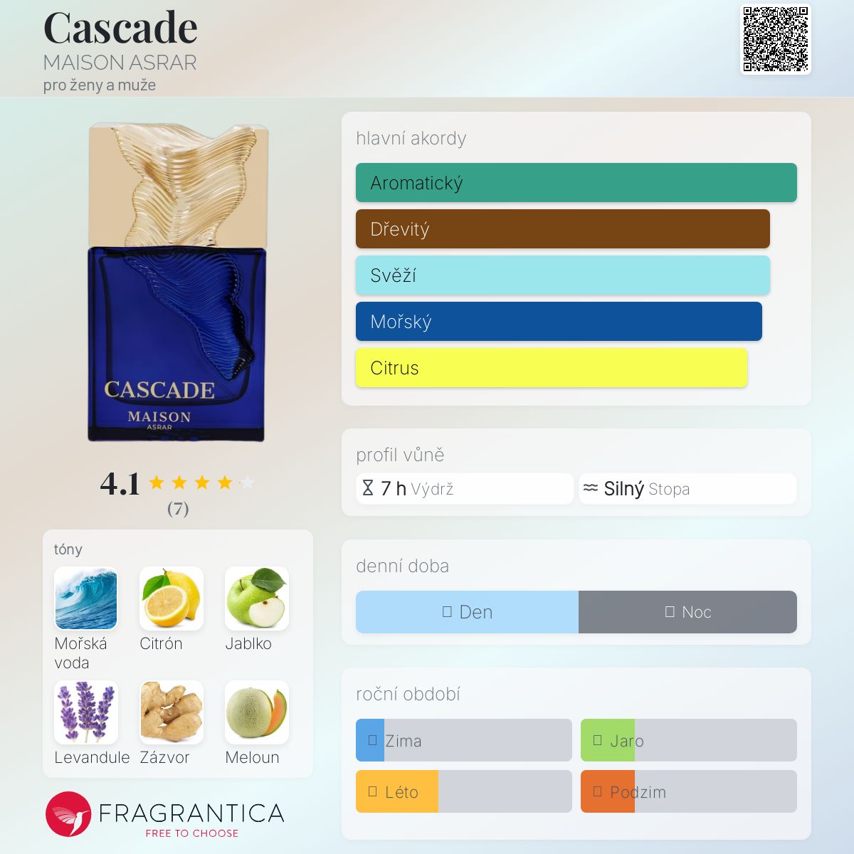 Cascade podle MAISON ASRAR je Aromatic Aquatic vůně pro ženy a muže. Toto je nová vůně. Cascade byl/a uveden/a v roce 2025. Vrchní tóny jsou Citrón, Zázvor a Meloun; střední tóny jsouMořské tóny, Jablko, Levandule a Suché dřevo ; základní tóny jsou Jantar (ambra), Pižmo, Santalové dřevo a Pačuli.