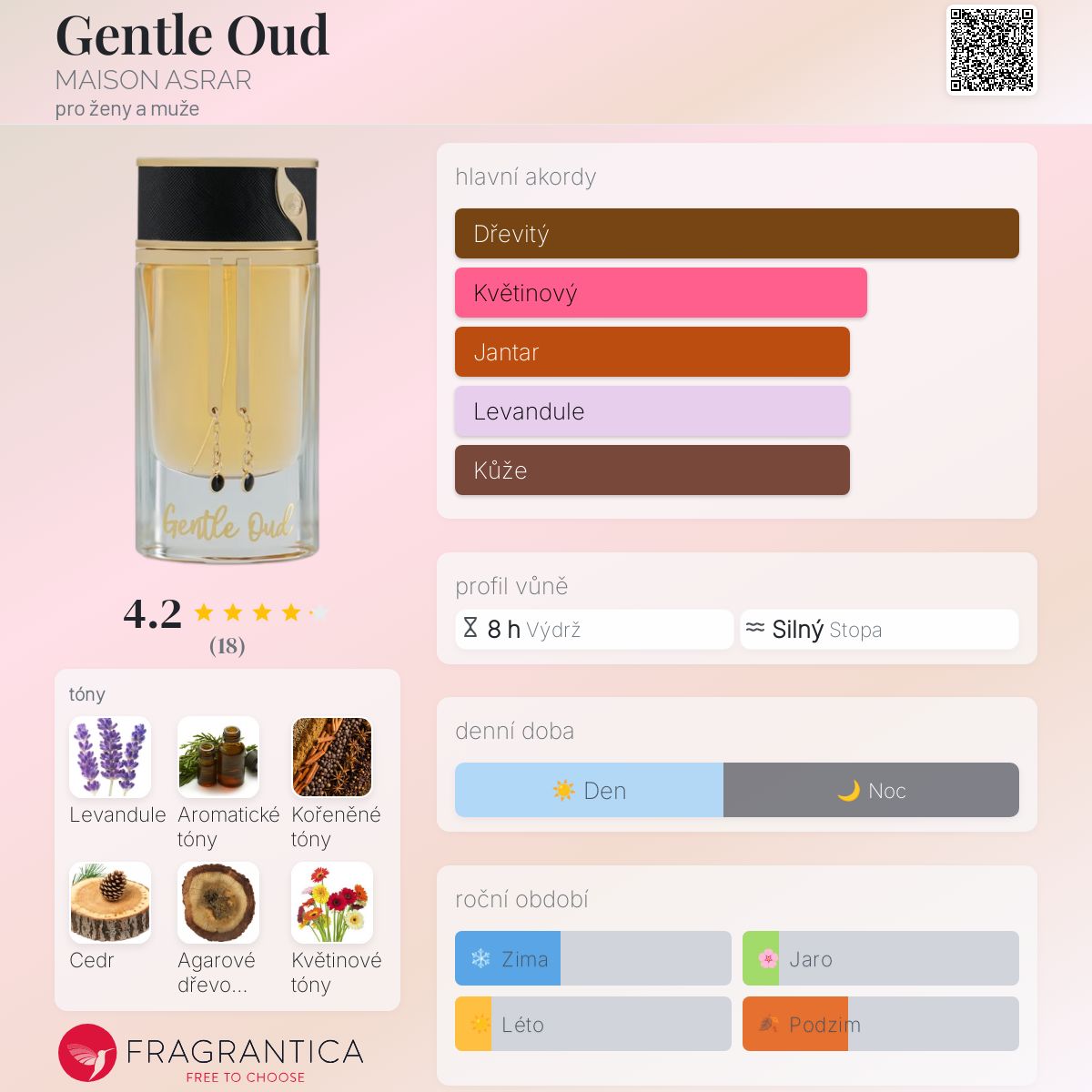 Gentle Oud podle MAISON ASRAR je Orientální Woody vůně pro ženy a muže. Gentle Oud byl/a uveden/a v roce 2022. Vrchní tóny jsou Levandule, Aromatické tóny a Kořeněné tóny; střední tóny jsouCedr, Agarové dřevo (oud) a Květinové tóny ; základní tóny jsou Dřevité tóny, Kůže a Jantar (ambra).
