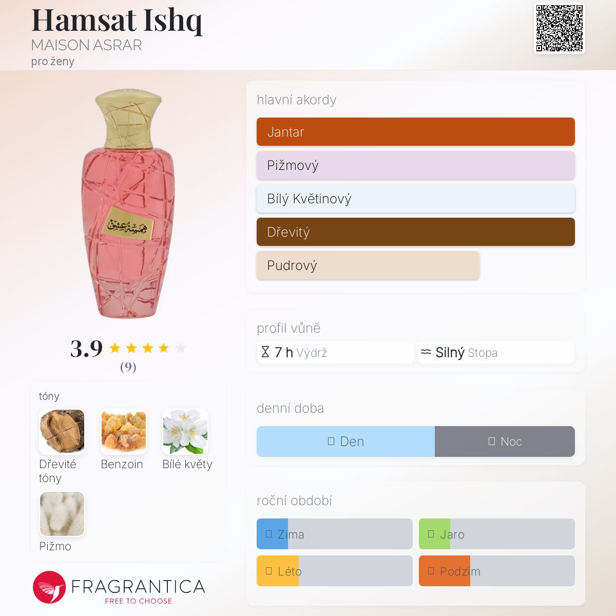 Hamsat Ishq podle MAISON ASRAR je Floral Woody Musk vůně pro ženy. Hamsat Ishq byl/a uveden/a v roce 2022. Vrchní tón je Dřevité tóny ; střední tóny jsouBenzoin a Bílé květy ; základní tón je Pižmo.