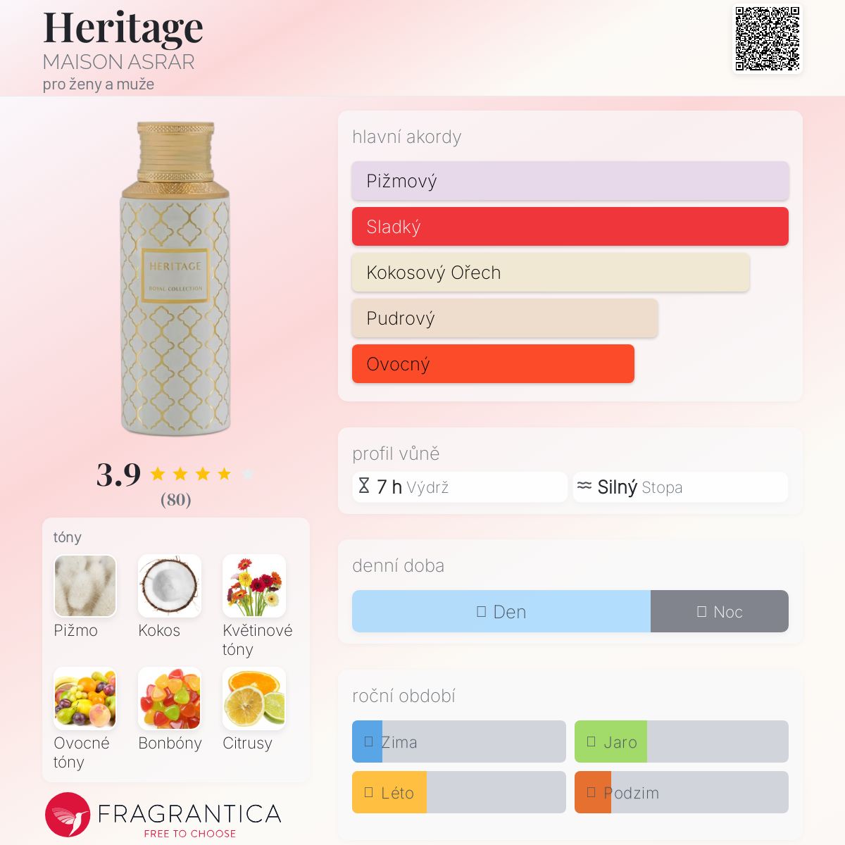 Heritage podle MAISON ASRAR je Floral Fruity vůně pro ženy a muže. Heritage byl/a uveden/a v roce 2022. Vrchní tóny jsou Květinové tóny a Citrusy; střední tóny jsouKokos a Ovocné tóny ; základní tóny jsou Pižmo a Sladké tóny.