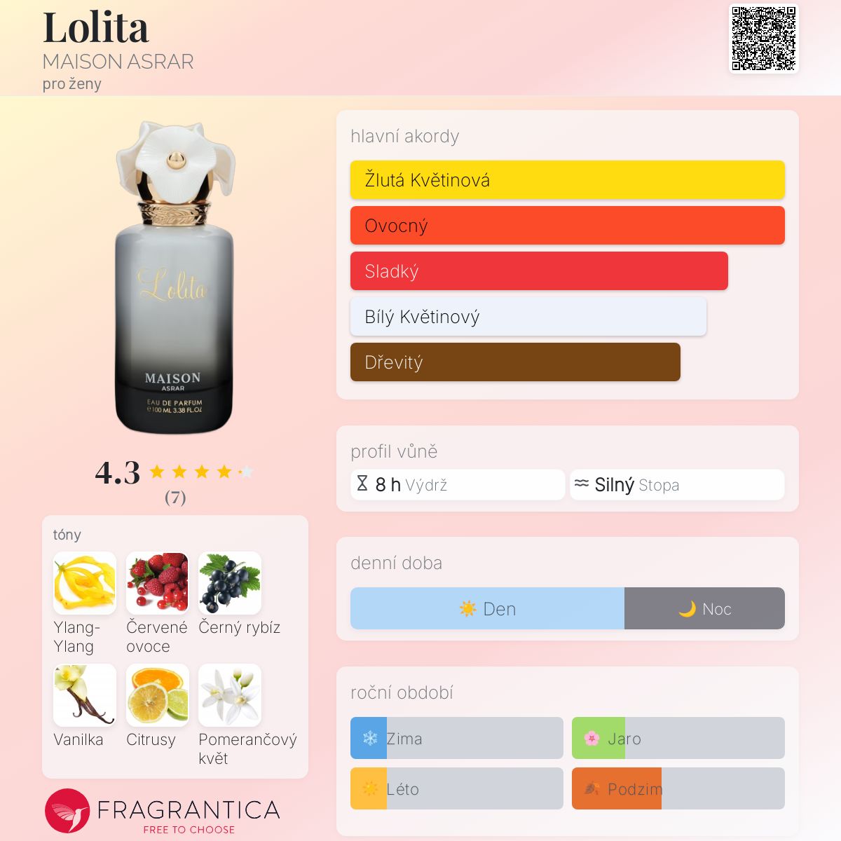 Lolita podle MAISON ASRAR je Floral Fruity vůně pro ženy. Toto je nová vůně. Lolita byl/a uveden/a v roce 2024. Vrchní tóny jsou Ylang-Ylang, Červené ovoce, Černý rybíz a Citrusy; střední tóny jsouPomerančový květ, Tuberóza, Jasmín a Broskev ; základní tóny jsou Vanilka, Dřevité tóny, Jantar (ambra), Pačuli a Pižmo.