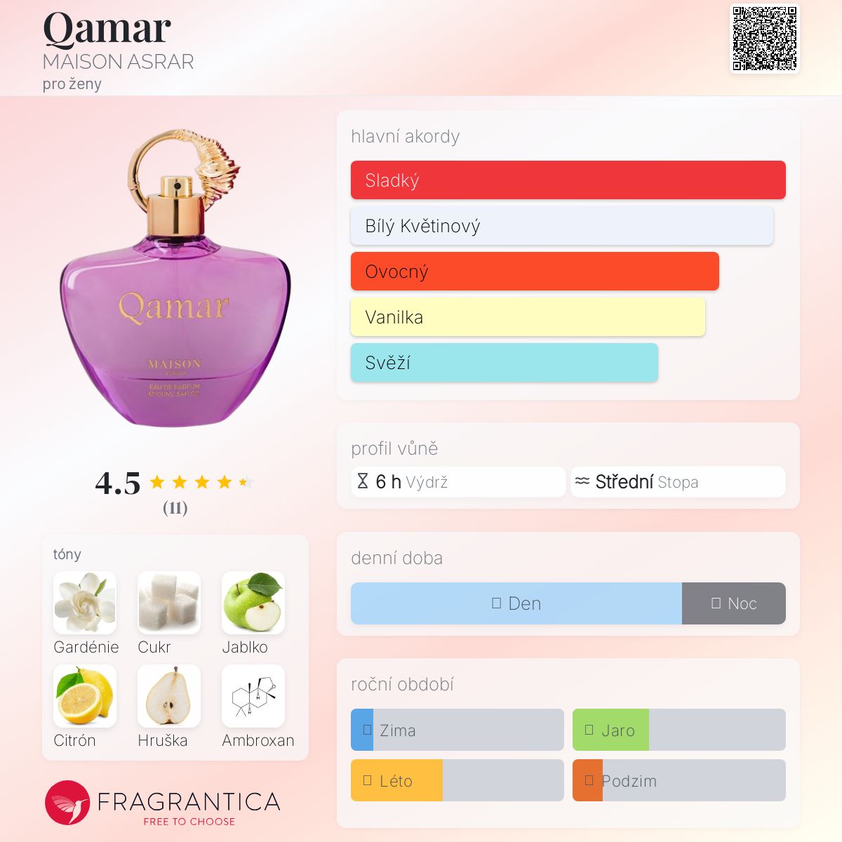 Qamar podle MAISON ASRAR je Floral Fruity vůně pro ženy. Toto je nová vůně. Qamar byl/a uveden/a v roce 2024. Vrchní tóny jsou Jablko, Citrón a Hruška; střední tóny jsouGardénie a Jasmín ; základní tóny jsou Cukr, Ambroxan a Vanilka.