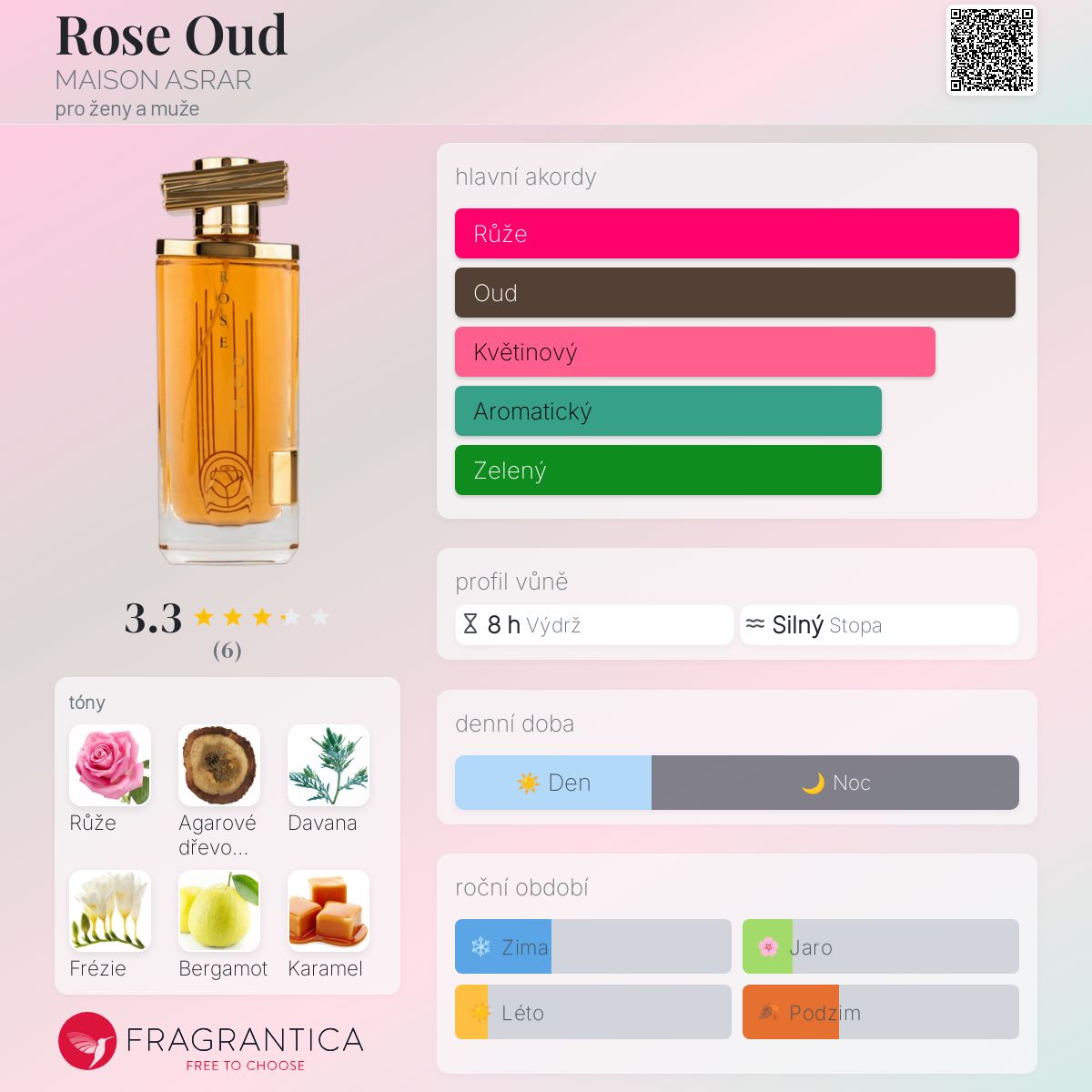 Rose Oud podle MAISON ASRAR je Orientální Floral vůně pro ženy a muže. Rose Oud byl/a uveden/a v roce 2022. Vrchní tóny jsou Davana, Bergamot a Karamel; střední tóny jsouRůže, Frézie a Konvalinka ; základní tóny jsou Agarové dřevo (oud), Ambra a Kůže.