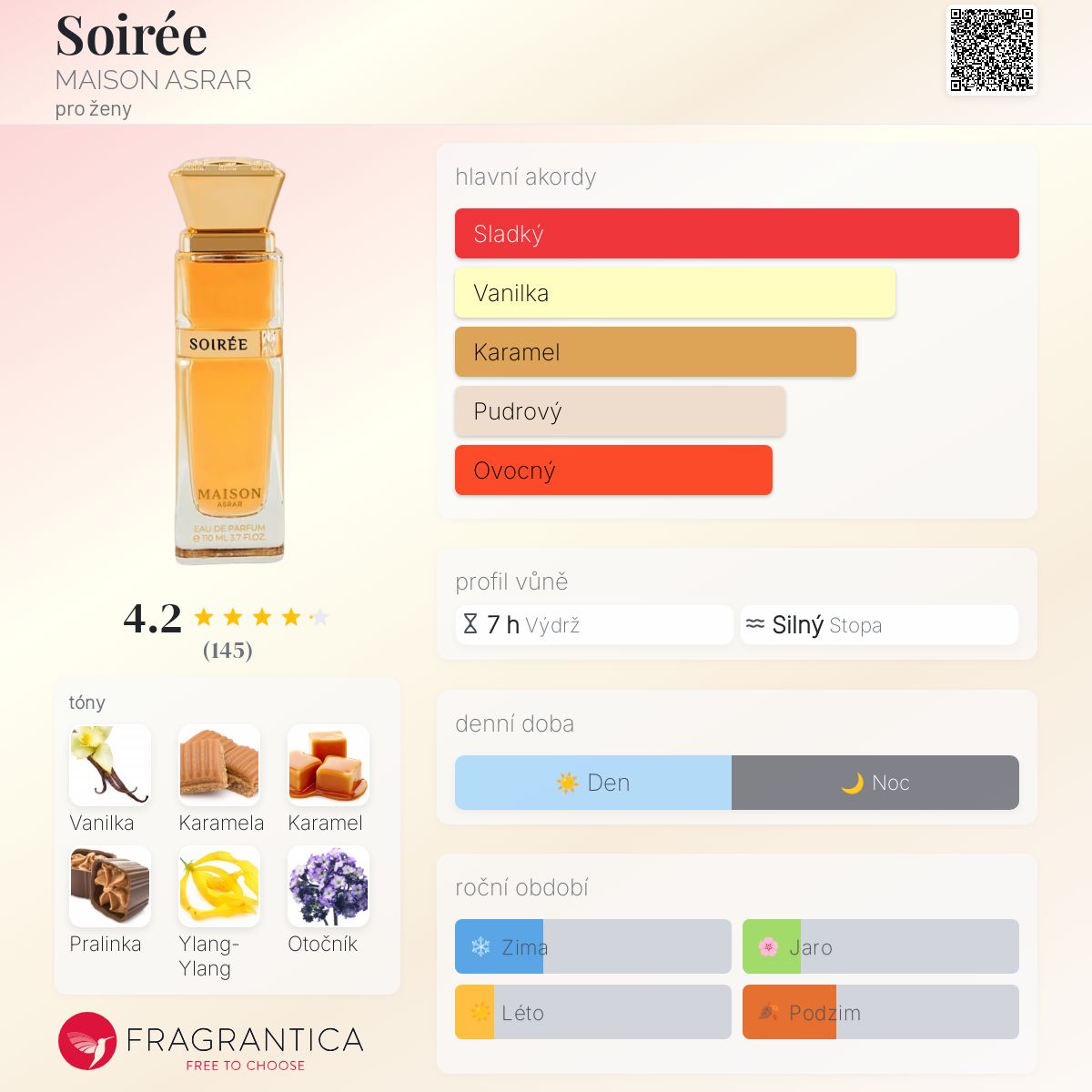 Soirée podle MAISON ASRAR je Floral Fruity Gourmand vůně pro ženy. Toto je nová vůně. Soirée byl/a uveden/a v roce 2024. Vrchní tóny jsou Vanilka, Karamela, Pralinka, Jablko a Švestka; střední tóny jsouYlang-Ylang, Otočník, Bílé květy a Levandule ; základní tóny jsou Vanilka, Karamel, Dřevité tóny a Ambra.