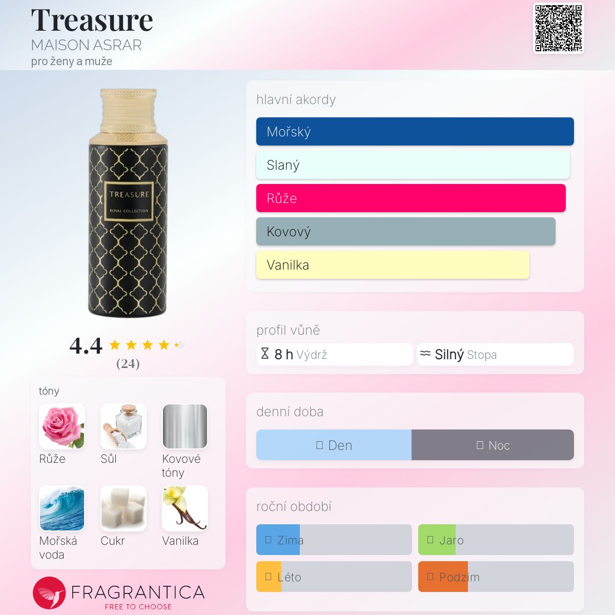Treasure podle MAISON ASRAR je Floral Aquatic vůně pro ženy a muže. Treasure byl/a uveden/a v roce 2022. Vrchní tóny jsou Sůl, Kovové tóny a Vodní tóny; střední tóny jsouRůže a Cukr ; základní tóny jsou Vanilka, Ambroxan a Suché dřevo.