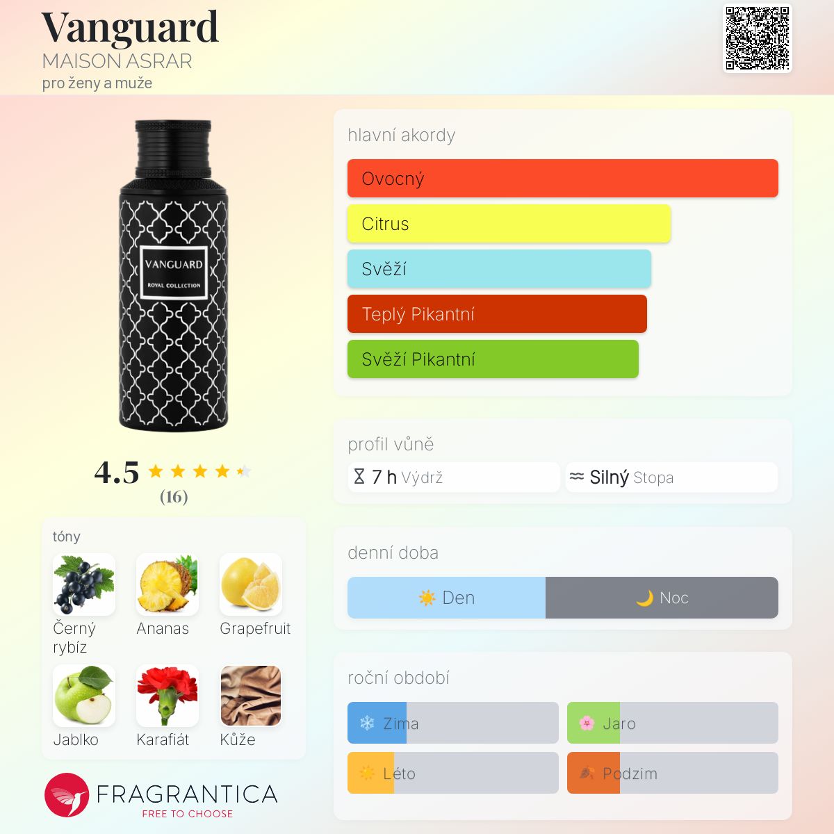 Vanguard podle MAISON ASRAR je Chypre vůně pro ženy a muže. Toto je nová vůně. Vanguard byl/a uveden/a v roce 2025. Vrchní tóny jsou Černý rybíz, Ananas, Grapefruit, Jablko, Růžový pepř a Bergamot; střední tóny jsouKarafiát, Kardamom, Zázvor a Konvalinka ; základní tóny jsou Kůže, Ambra, Cedr, Pižmo, Kašmírové pižmo a Mech.