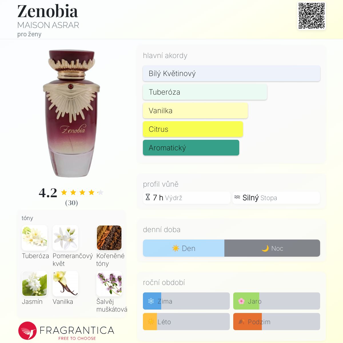 Zenobia podle MAISON ASRAR je Orientální Floral vůně pro ženy. Zenobia byl/a uveden/a v roce 2022. Vrchní tóny jsou Kořeněné tóny, Šalvěj muškátová a Bergamot; střední tóny jsouTuberóza, Pomerančový květ a Jasmín ; základní tóny jsou Vanilka, Fazole tonka a Dřevité tóny.