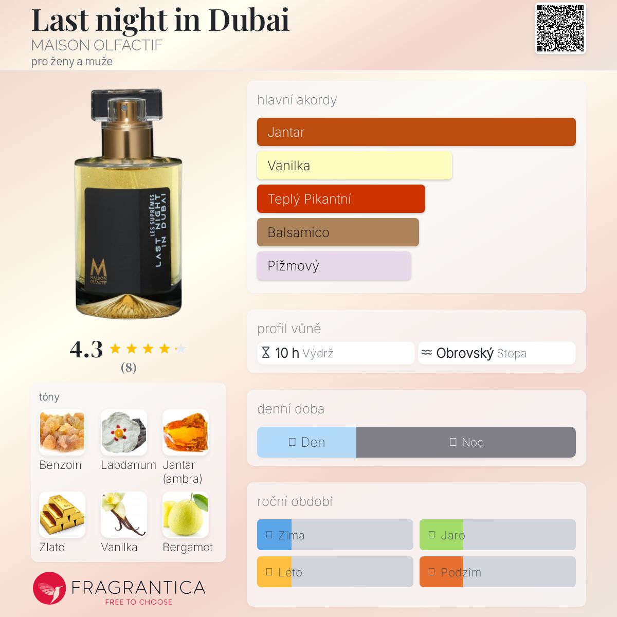 Last night in Dubai podle MAISON OLFACTIF je Orientální Woody vůně pro ženy a muže. Last night in Dubai byl/a uveden/a v roce 2023. Vrchní tóny jsou Bergamot a Levandule; střední tóny jsouLabdanum, Jantar (ambra) a Vanilka ; základní tóny jsou Benzoin, Zlato a Fazole tonka.
