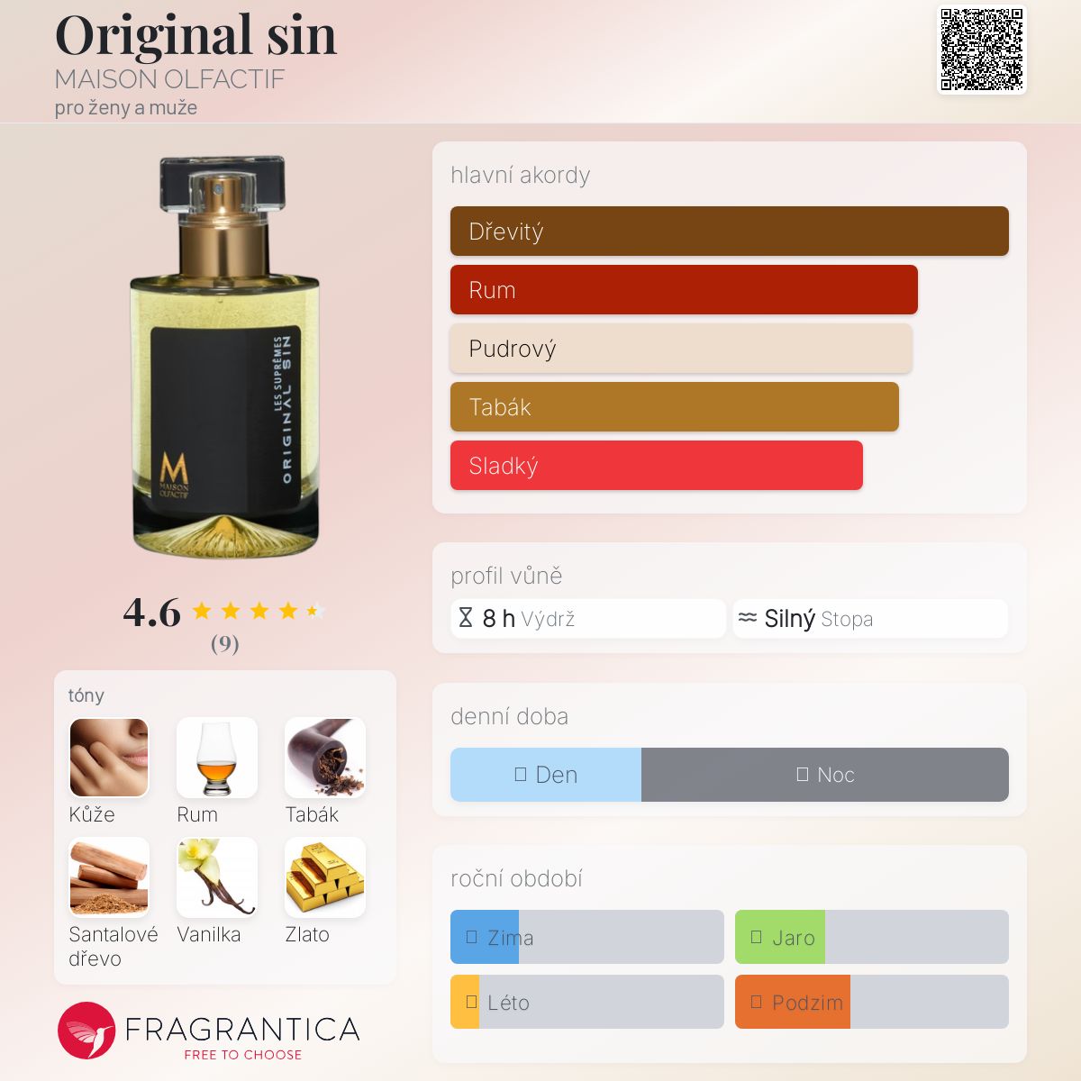 Original sin podle MAISON OLFACTIF je Aromatic Fougere vůně pro ženy a muže. Original sin byl/a uveden/a v roce 2023. Vrchní tón je Jasmín ; střední tóny jsouVanilka, Skořice a Šafrán ; základní tóny jsou Kůže, Rum, Tabák, Santalové dřevo a Zlato.
