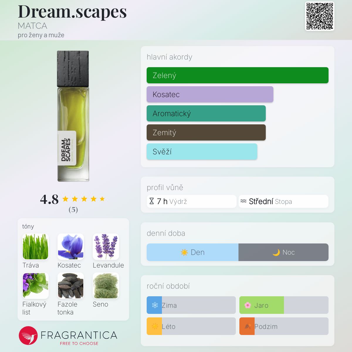 Dream.scapes podle MATCA je vůně pro ženy a muže. Toto je nová vůně. Dream.scapes byl/a uveden/a v roce 2025. Vrchní tóny jsou Zelená tráva a Bergamot; střední tóny jsouKosatec, Levandule, Plumérie a Galbanum ; základní tóny jsou Fialkový list, Fazole tonka, Seno, Vetiver, Pačuli a Dubový mech.