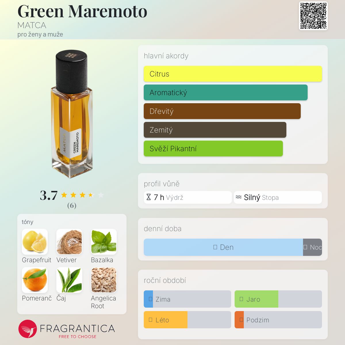 Green Maremoto podle MATCA je Aromatic Green vůně pro ženy a muže. Green Maremoto byl/a uveden/a v roce 2021. Vrchní tóny jsou Grapefruit, Bazalka a Sladký pomeranč; střední tóny jsouZelený čaj a Kořen anděliky ; základní tóny jsou Vetiver, Houby a Cedr.