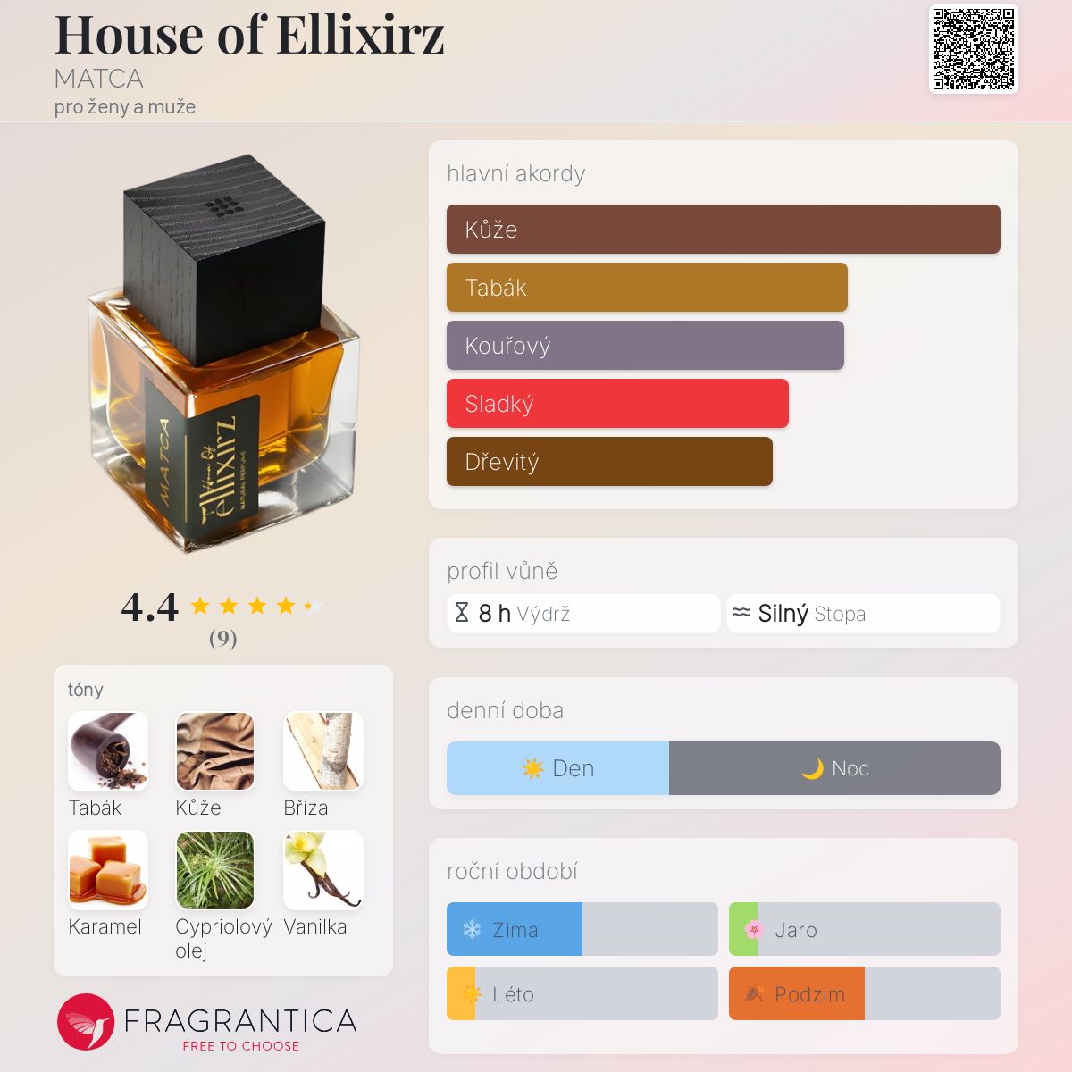 House of Ellixirz podle MATCA je Leather vůně pro ženy a muže. House of Ellixirz byl/a uveden/a v roce 2021. Vrchní tóny jsou Citrón a Petitgrain; střední tóny jsouKasie a Růžový olej ; základní tóny jsou Tabák, Kůže, Bříza, Karamel, Cypriolový olej a Vanilka.