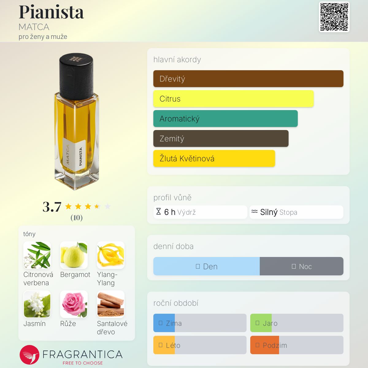 Pianista podle MATCA je Floral Fruity vůně pro ženy a muže. Pianista byl/a uveden/a v roce 2020. Vrchní tóny jsou Sporýš a Bergamot; střední tóny jsouYlang-Ylang, Jasmín a Růže ; základní tóny jsou Santalové dřevo, Myrha, Vetiver a Dubový mech.