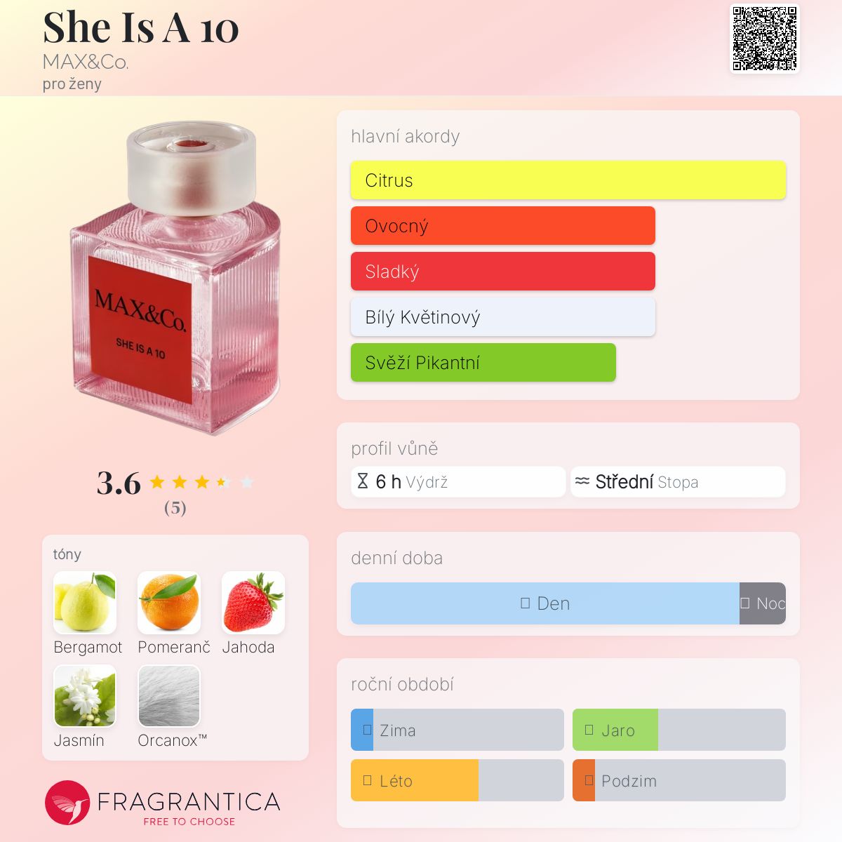 She Is A 10 podle MAX&Co. je Floral Fruity vůně pro ženy. Toto je nová vůně. She Is A 10 byl/a uveden/a v roce 2025. "Nosem" za touto vůní je Violaine Collas. Vrchní tóny jsou Bergamot a Pomeranč; střední tóny jsouJahoda a Jasmín ; základní tón je Orcanox™.