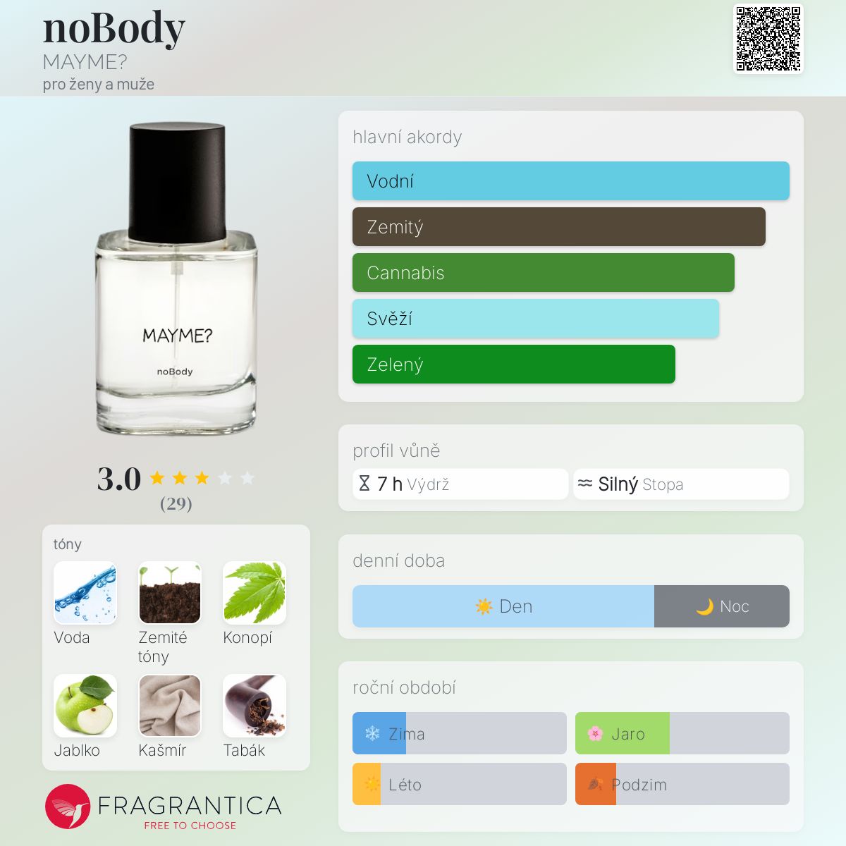 noBody podle MAYME? je Aromatic Green vůně pro ženy a muže. noBody byl/a uveden/a v roce 2021. "Nosem" za touto vůní je Maria Molchanova.