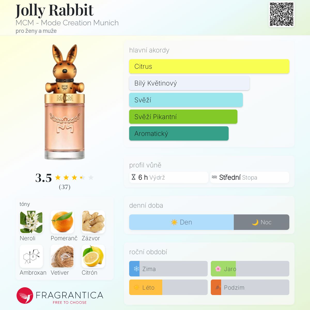Jolly Rabbit podle MCM - Mode Creation Munich je Chypre Fruity vůně pro ženy a muže. Toto je nová vůně. Jolly Rabbit byl/a uveden/a v roce 2025. "Nosem" za touto vůní je Alexandra Monet. Vrchní tóny jsou Pomeranč, Citrón a Červený rybíz; střední tóny jsouNeroli, Zázvor a Jasmín ; základní tóny jsou Ambroxan, Vetiver a Guajakové dřevo.