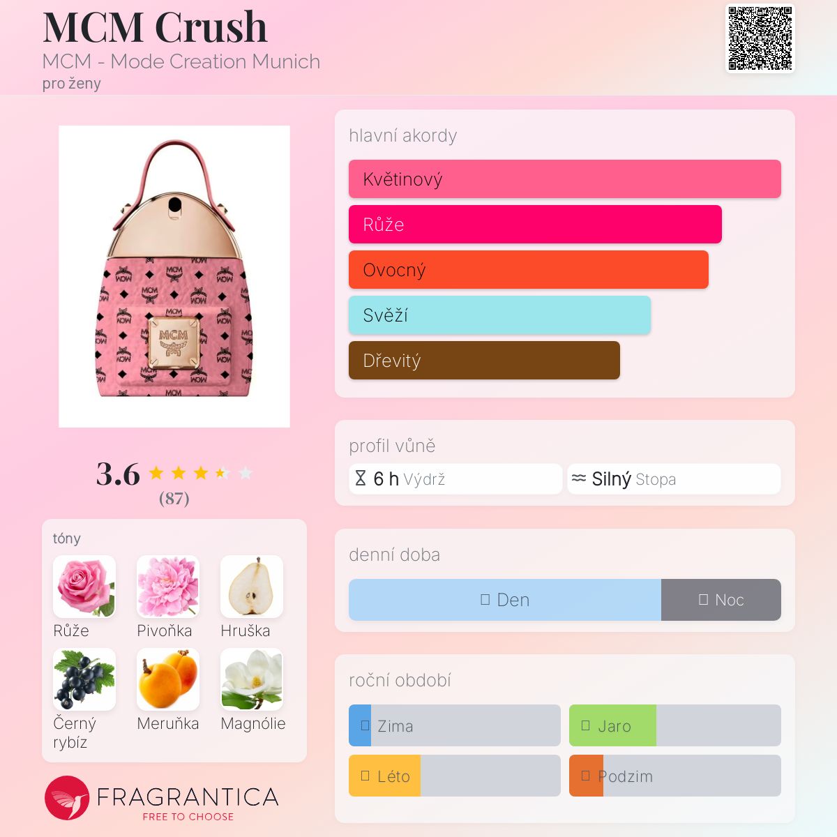 MCM Crush podle MCM - Mode Creation Munich je vůně pro ženy. Toto je nová vůně. MCM Crush byl/a uveden/a v roce 2024. "Nosem" za touto vůní je Frank Voelkl. Vrchní tóny jsou Hruška, Černý rybíz, Meruňka a Růžový pepř; střední tóny jsouKvětná růže, Pivoňka a Magnólie ; základní tóny jsou Kašmírové dřevo, Cedr a Ambrette (přírodní pižmo).