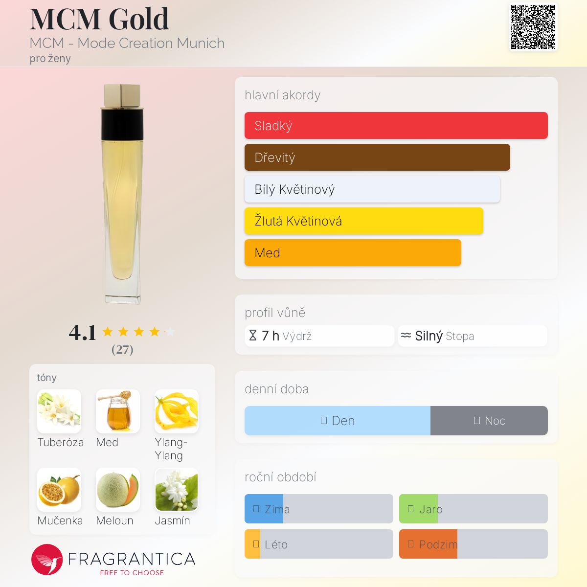 MCM Gold podle MCM - Mode Creation Munich je Orientální Floral vůně pro ženy. MCM Gold byl/a uveden/a v roce 1999. Vrchní tóny jsou Mučenka, Meloun, Mandarinka, Černý rybíz a Vodní meloun; střední tóny jsouTuberóza, Ylang-Ylang, Jasmín, Mimóza, Hřebíček, Skořice, Růže, Fialka a Žlutý leknín ; základní tóny jsou Med, Labdanum, Cedr, Myrha, Vetiver, Fazole tonka, Vanilka a Santalové dřevo.