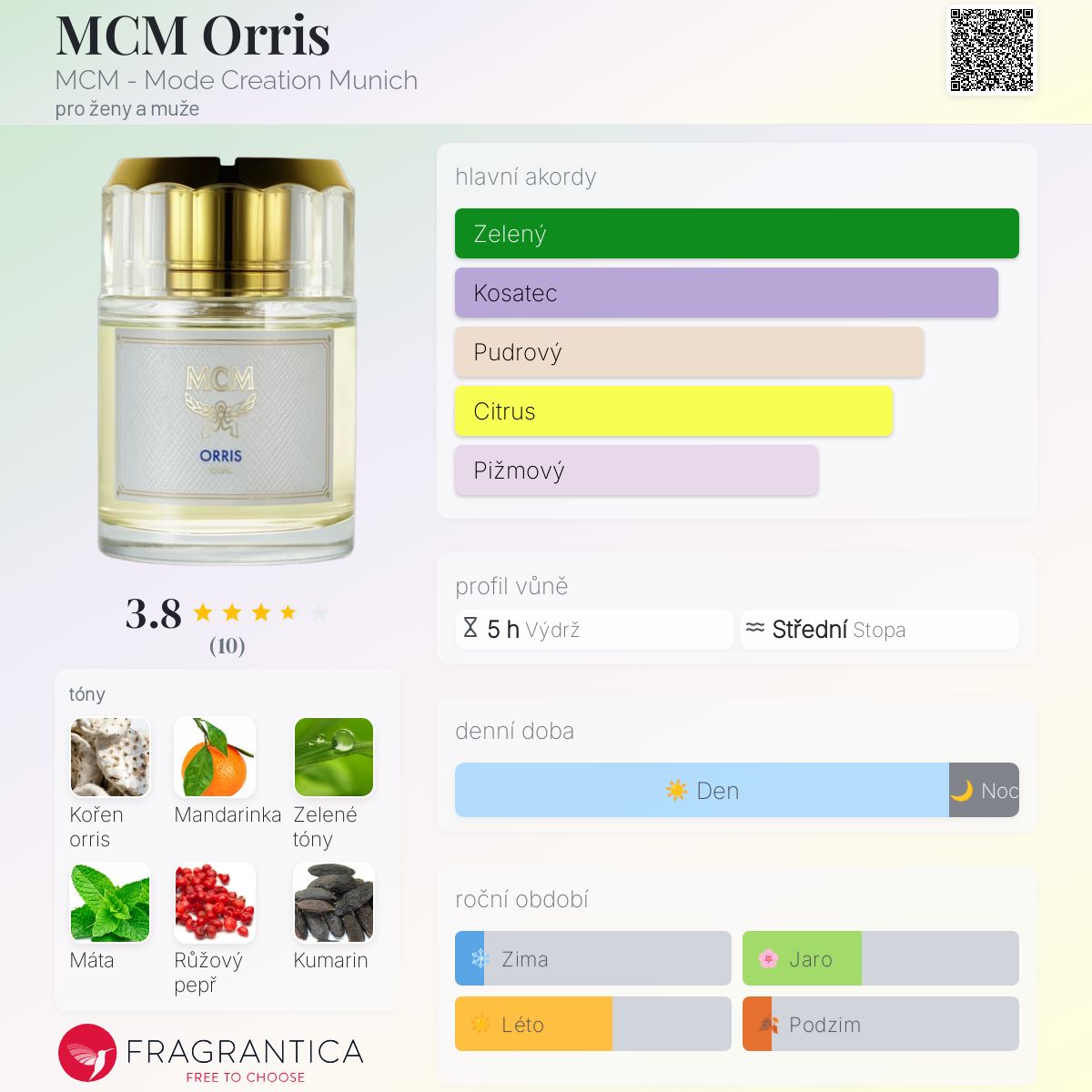 MCM Orris podle MCM - Mode Creation Munich je Orientální Floral vůně pro ženy a muže. MCM Orris byl/a uveden/a v roce 2017. Vrchní tóny jsou Zelená mandarinka, Zelené tóny a Máta; střední tóny jsouOrris a Růžový pepř ; základní tóny jsou Kumarin a Pižmo.