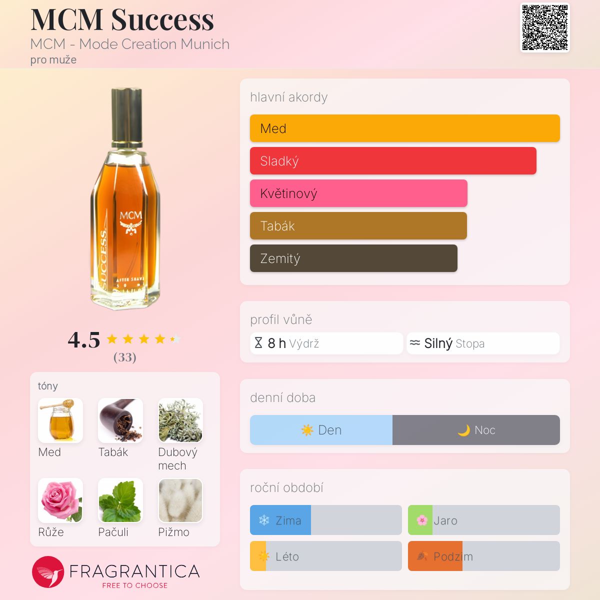MCM Success podle MCM - Mode Creation Munich je Woody Chypre vůně pro muže. MCM Success byl/a uveden/a v roce 1986. Vrchní tóny jsou Med, Tabák, Růže, Pomeranč, Bergamot a Citrón; střední tóny jsouPačuli, Karafiát, Orris, Vetiver, Cedr a Jasmín ; základní tóny jsou Med, Dubový mech, Pižmo, Kůže, Vanilka, Benzoin a Jantar (ambra).