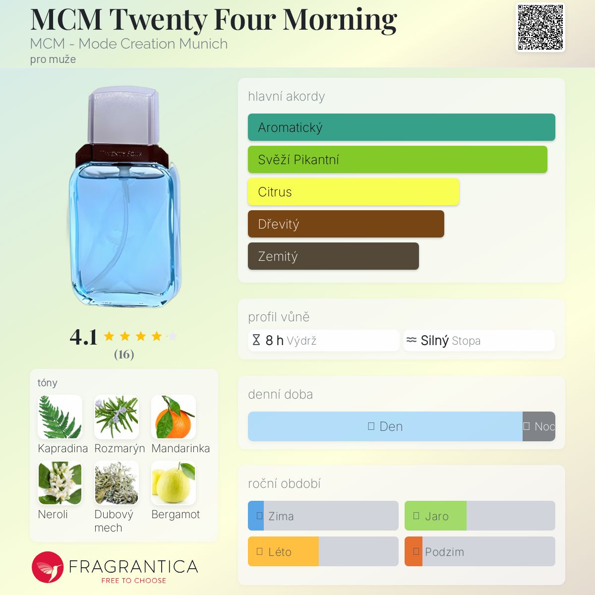 MCM Twenty Four Morning podle MCM - Mode Creation Munich je Aromatic Fougere vůně pro muže. MCM Twenty Four Morning byl/a uveden/a v roce 1993. Vrchní tóny jsou Rozmarýn, Mandarinka, Neroli, Bergamot, Bazalka, Zelené tóny, Citrón a Levandule; střední tóny jsouKapradina, Muškátový oříšek, Jedle, Jasmín, Koriandr a Pelargónie ; základní tóny jsou Mech, Pižmo, Cedr, Fazole tonka a Jantar (ambra).