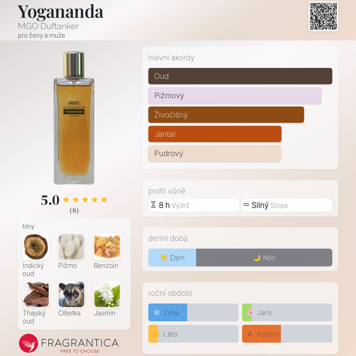 Yogananda podle MGO Duftanker je vůně pro ženy a muže. Yogananda byl/a uveden/a v roce 2017. "Nosem" za touto vůní je Hans Georg Staudt. Vrchní tóny jsou Jasmín, Kašmír a Bergamot; střední tóny jsouIndický oud, Benzoin, Cedr, Růže a Neroli ; základní tóny jsou Pižmo, Thajský oud, Cibetka, Vanilka a Dubový mech.