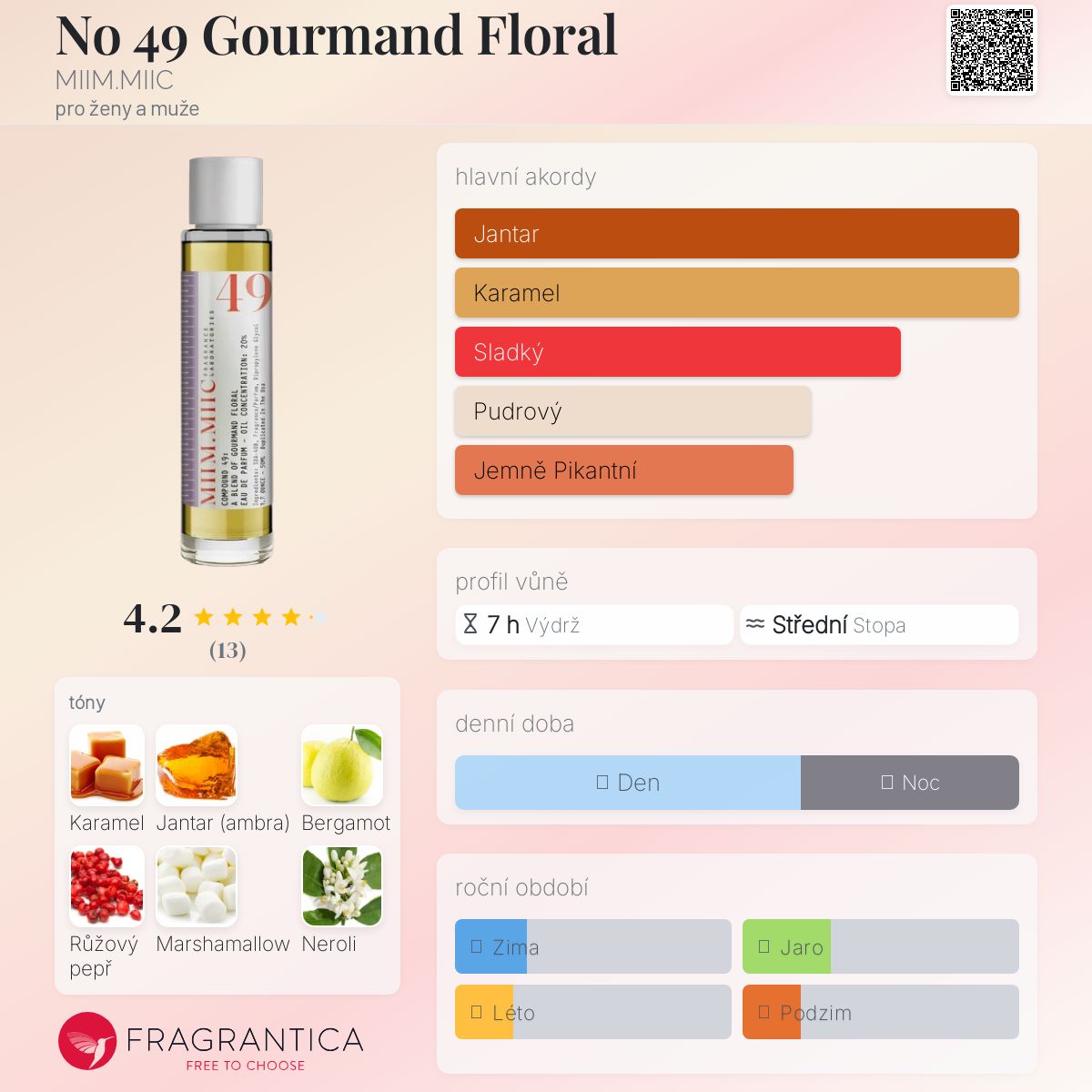 No 49 Gourmand Floral podle MIIM.MIIC je vůně pro ženy a muže. No 49 Gourmand Floral byl/a uveden/a v roce 2024. Vrchní tóny jsou Bergamot, Růžový pepř a Neroli; střední tóny jsouPomerančový květ, Zimolez, Jasmín a Růže ; základní tóny jsou Karamel, Jantar (ambra) a Marshamallow.