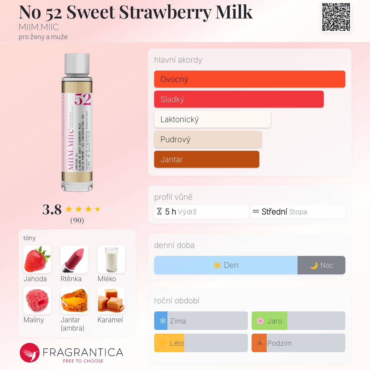 No 52 Sweet Strawberry Milk podle MIIM.MIIC je vůně pro ženy a muže. No 52 Sweet Strawberry Milk byl/a uveden/a v roce 2024. Vrchní tóny jsou Jahoda, Maliny, Rtěnka a Švestka; střední tón jeMléko ; základní tóny jsou Jantar (ambra) a Karamel.