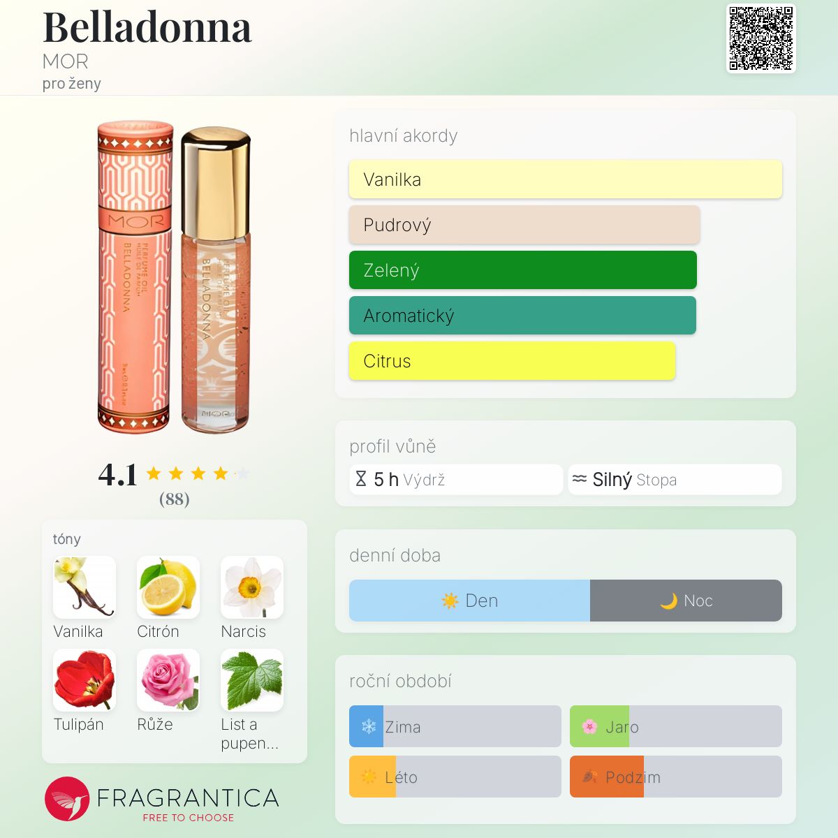 Belladonna podle MOR je Floral vůně pro ženy. Belladonna byla spuštěna během 2000. Vrchní tón je Citron amalfi ; střední tóny jsouNarcis, Růžový tulipán a Růže ; základní tóny jsou Vanilka, Černý rybíz, Pižmo a Santalové dřevo.