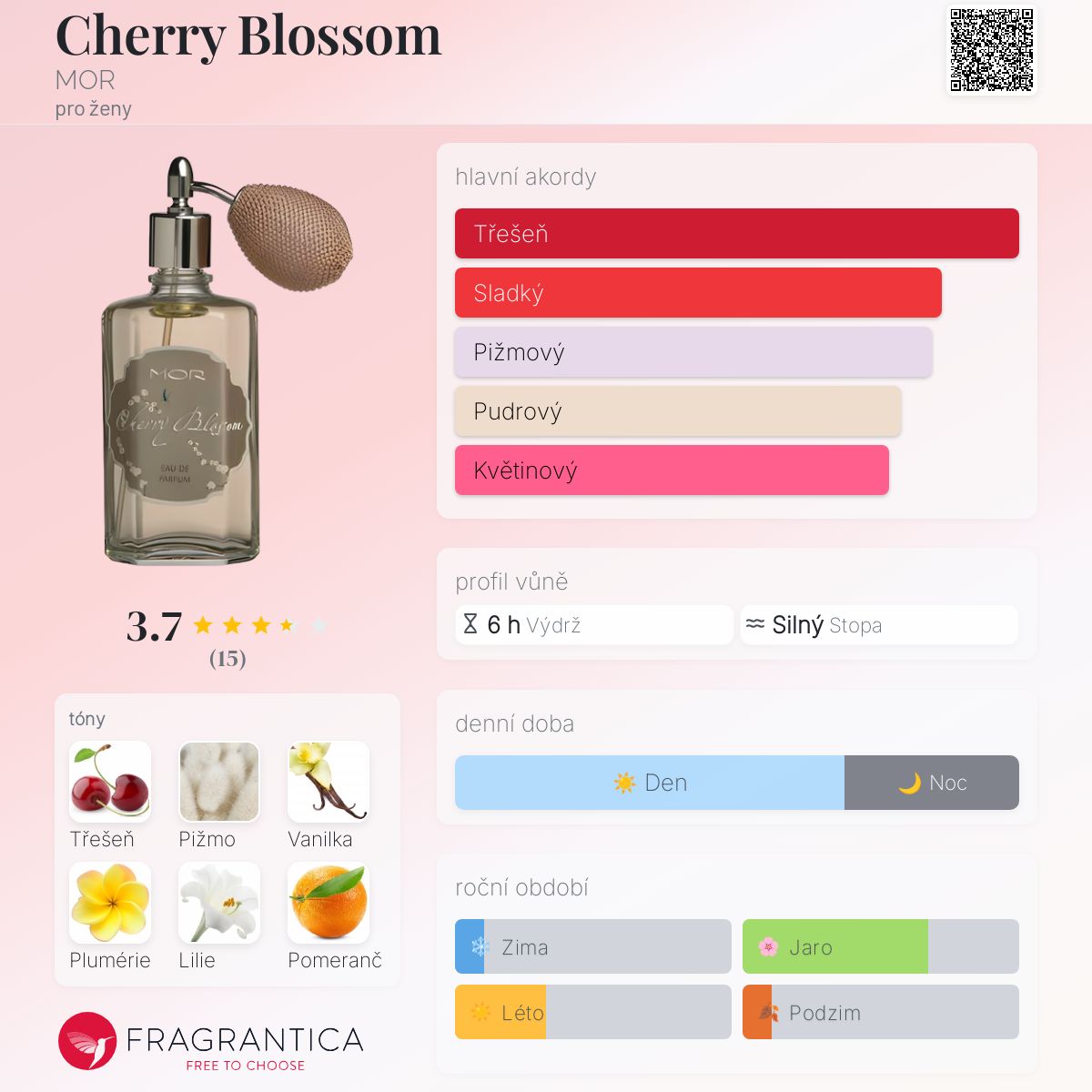 Cherry Blossom podle MOR je Floral Fruity vůně pro ženy. Vrchní tóny jsou Plumérie, Pomeranč, Jasmín, Fialka a Ibišek; střední tóny jsouTřešeň, Lilie a Pelargónie ; základní tóny jsou Pižmo, Vanilka a Jantar (ambra).