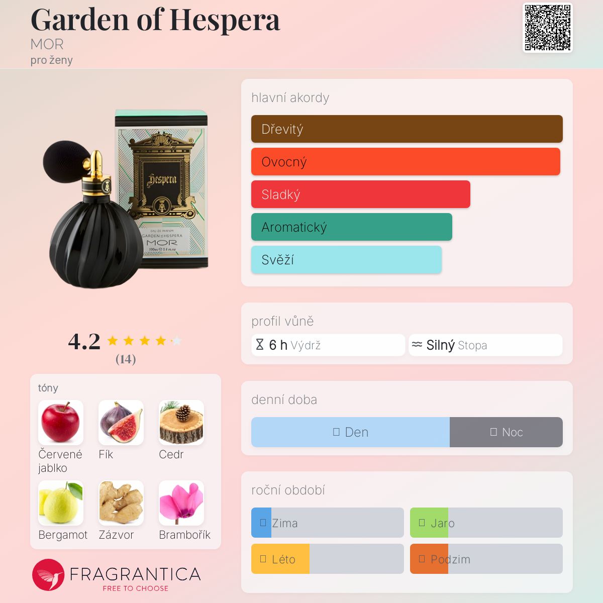 Garden of Hespera podle MOR je Chypre Fruity vůně pro ženy. Garden of Hespera byl/a uveden/a v roce 2008. Vrchní tóny jsou Červené jablko, Černý fík, Bergamot a Bobkový list; střední tóny jsouZázvor, Brambořík, Kardamom, Růže a Otočník ; základní tóny jsou Virginský cedr, Dubový mech, Cypřiš a Pižmo.