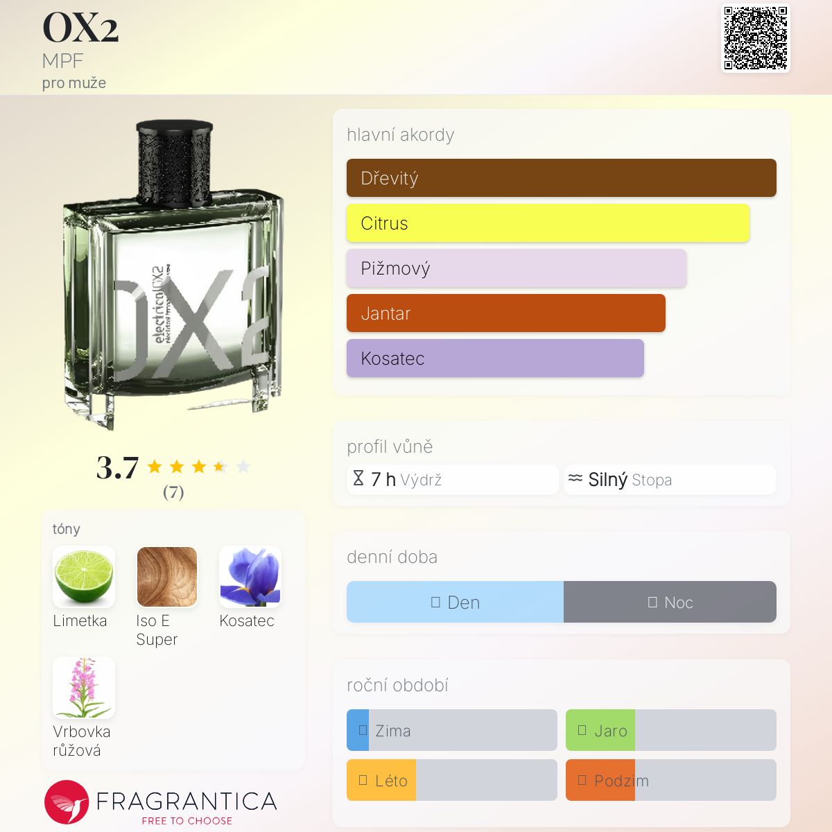 OX2 podle MPF je Floral Woody Musk vůně pro muže. Vrchní tóny jsou Limetka a Vrbovka růžová; střední tón jeKosatec ; základní tón je Iso E Super.