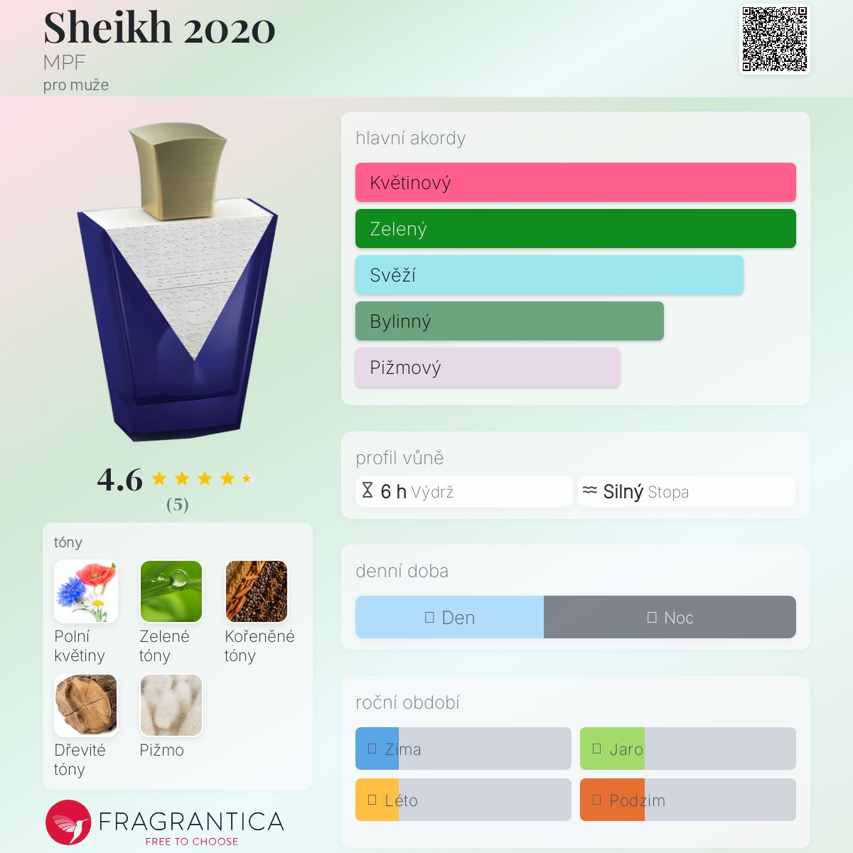 Sheikh 2020 podle MPF je Orientální Floral vůně pro muže. Vrchní tóny jsou Kořeněné tóny a Dřevité tóny; střední tón jePižmo ; základní tóny jsou Polní květiny a Bylinné tóny.