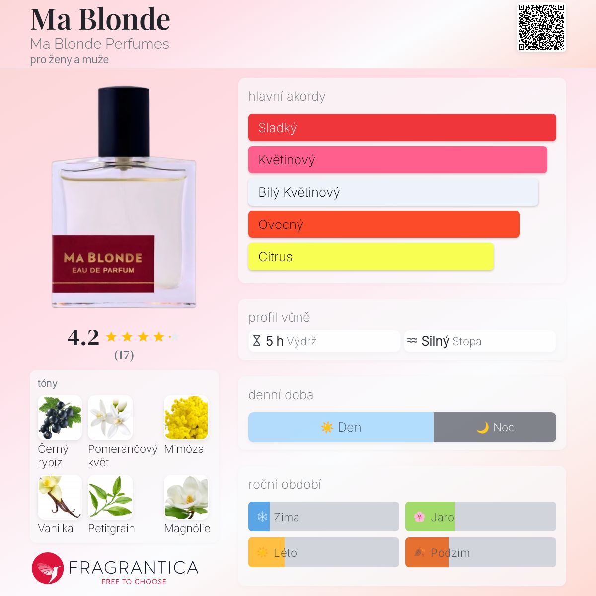 Ma Blonde podle Ma Blonde Perfumes je Floral Fruity vůně pro ženy a muže. Ma Blonde byl/a uveden/a v roce 2019. "Nosem" za touto vůní je Jean Claude Delville. Vrchní tóny jsou Černý rybíz, Mandarinkový list, Maliny a Bergamot; střední tóny jsouPomerančový květ, Mimóza, Magnólie, Jasmín, Tuberóza, Mandlový květ a Pivoňka ; základní tóny jsou Vanilka, Med, Marshamallow, Fazole tonka, Santalové dřevo, Jantar (ambra), Pačuli, Vetiver a Kůže.