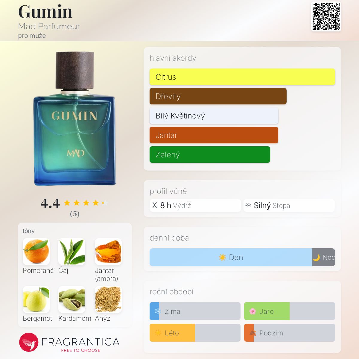 Gumin podle Mad Parfumeur je Citrus vůně pro muže. Toto je nová vůně. Gumin byl/a uveden/a v roce 2025. Vrchní tóny jsou Pomeranč, Bergamot, Kardamom a Anýz; střední tóny jsouČaj, Konvalinka, Jasmín, Růže a Kosatec ; základní tóny jsou Jantar (ambra), Dřevité tóny a Santalové dřevo.