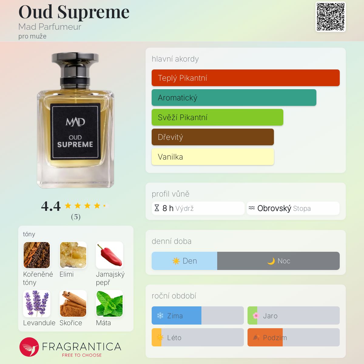 Oud Supreme podle Mad Parfumeur je Woody vůně pro muže. Vrchní tóny jsou Koření, Elemi a Chilli papričky; střední tóny jsouLevandule, Skořice a Máta ; základní tóny jsou Guajakové dřevo, Vanilka, Kůže a Agarové dřevo (oud).