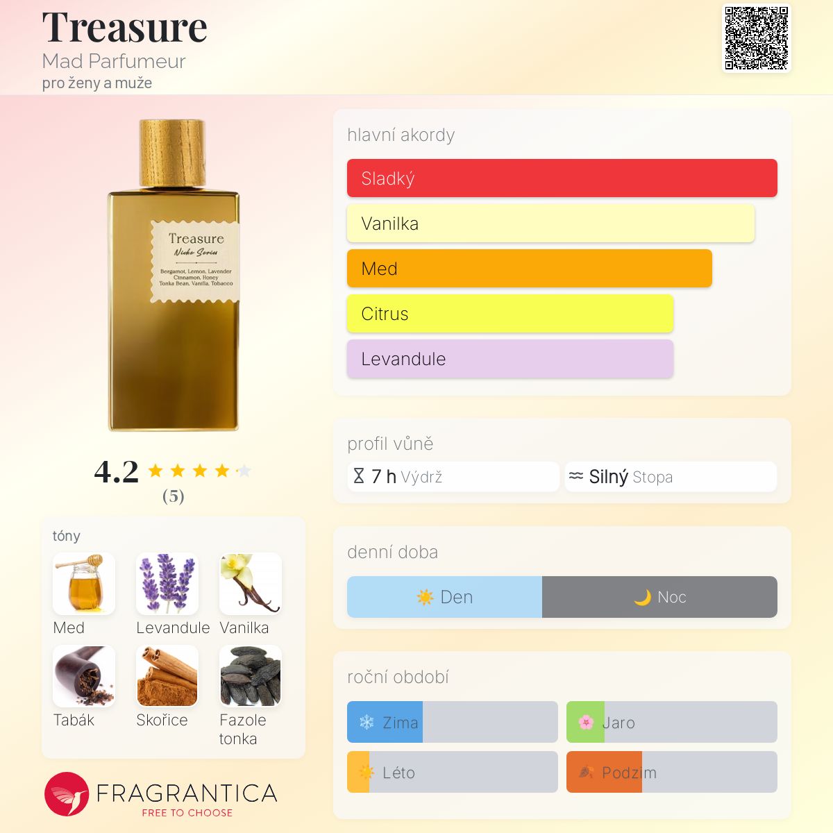 Treasure podle Mad Parfumeur je Orientální vůně pro ženy a muže. Vrchní tóny jsou Levandule, Bergamot a Citrón; střední tóny jsouMed a Skořice ; základní tóny jsou Vanilka, Tabák a Fazole tonka.