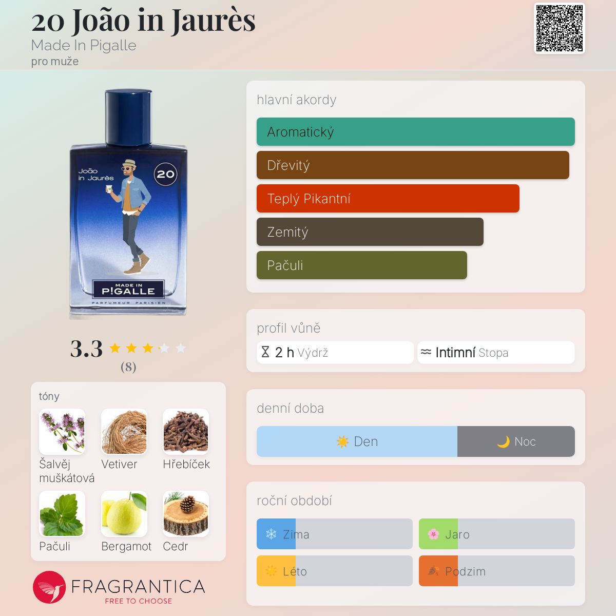 20 João in Jaurès podle Made In Pigalle je vůně pro muže. 20 João in Jaurès byl/a uveden/a v roce 2017. Vrchní tóny jsou Šalvěj muškátová, Hřebíček a Bergamot; střední tóny jsouJava vetiverový olej, Pačuli a Marocký cedr ; základní tóny jsou Santalové dřevo a Jantar (ambra).