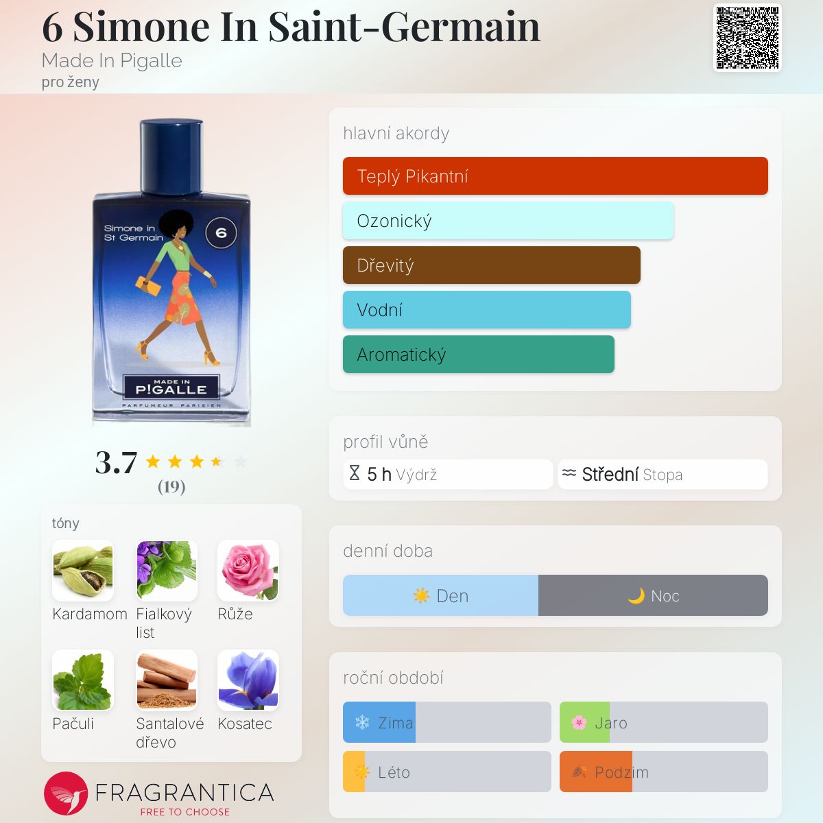 6 Simone In Saint-Germain podle Made In Pigalle je vůně pro ženy. 6 Simone In Saint-Germain byl/a uveden/a v roce 2017. Vrchní tóny jsou Guatemalský kardamom a Fialkový list; střední tóny jsouRůže, Pačuli a Kosatec ; základní tóny jsou Santalové dřevo a Bílé pižmo.