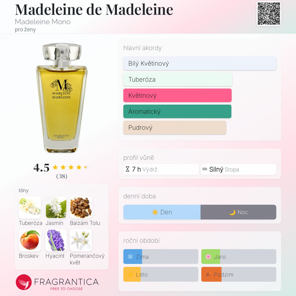 Madeleine de Madeleine podle Madeleine Mono je Floral vůně pro ženy. Madeleine de Madeleine byl/a uveden/a v roce 1978. Vrchní tóny jsou Broskev, Hyacint, Bergamot a Mandarinka; střední tóny jsouTuberóza, Jasmín, Pomerančový květ, Pelargónie, Vonokvětka, Koriandr, Fialka a Konvalinka ; základní tóny jsou Balzám Tolu, Dubový mech, Vetiver, Santalové dřevo a Kosatec.