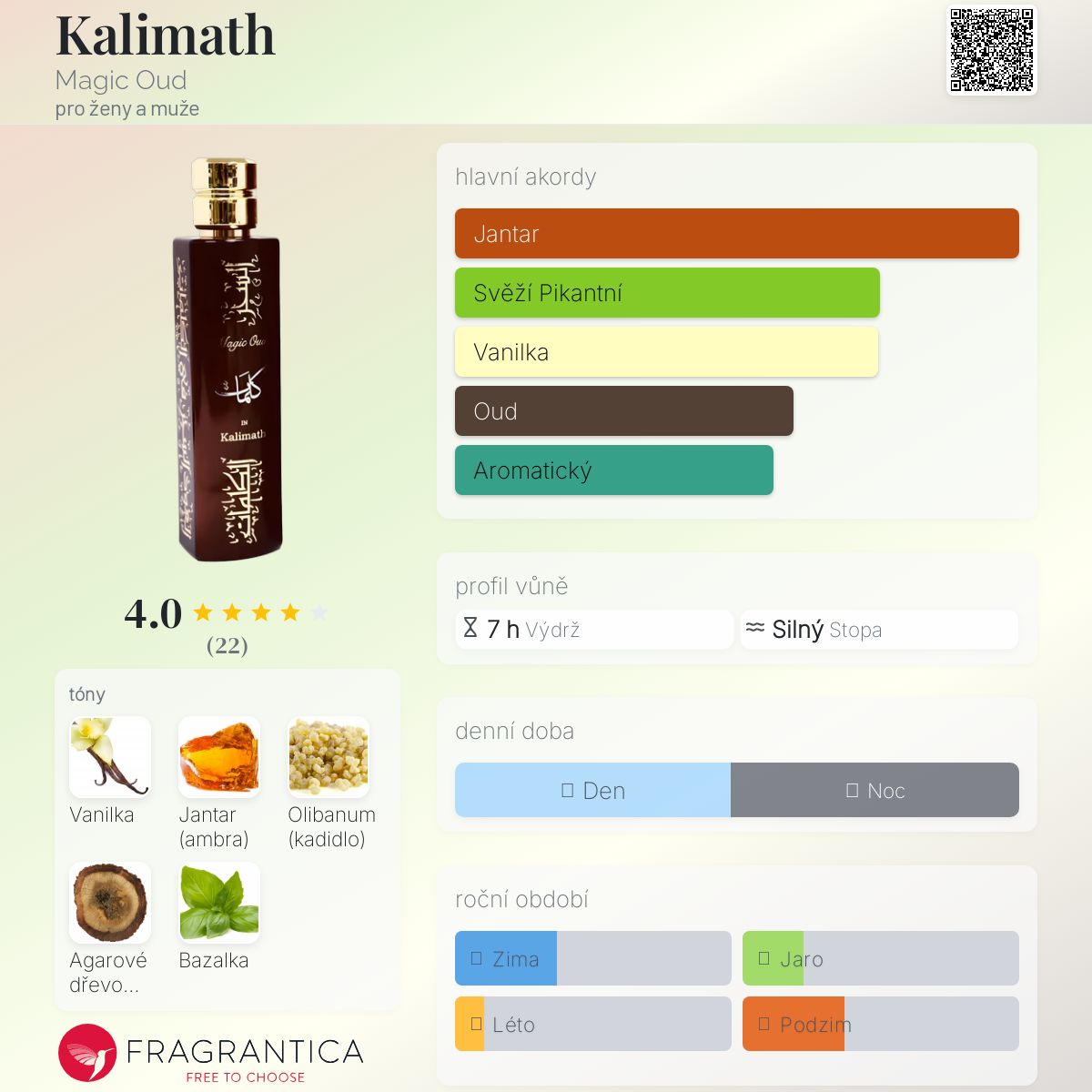 Kalimath podle Magic Oud je Orientální Vanilla vůně pro ženy a muže. Kalimath byl/a uveden/a v roce 2020. Vrchní tóny jsou Olibanum a Bazalka; střední tón jeVanilka ; základní tóny jsou Jantar (ambra) a Agarové dřevo (oud).