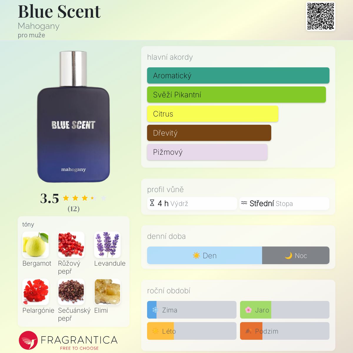 Blue Scent podle Mahogany je Aromatic Fougere vůně pro muže. Blue Scent byl/a uveden/a v roce 2021. "Nosem" za touto vůní je Roland Theil. Vrchní tóny jsou Bergamot, Růžový pepř a Levandule; střední tóny jsouPelargónie, Sečuánský pepř a Elemi ; základní tóny jsou Vetiver, Pačuli, Jantar (ambra) a Pižmo.